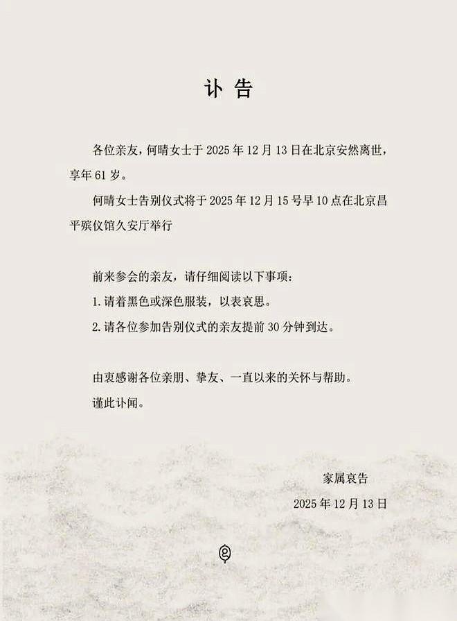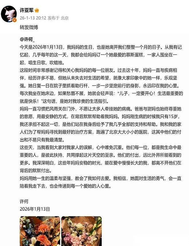 “生活最重要的就是快乐。” 这句话,从一个跟病魔死磕了整整十年的女人嘴里说出来,我听着,心都碎了。 何晴,那个印在我们记忆里,巧笑倩兮的古典美人。 刷到她儿子的长文,真的没绷住。 生日,成了忌日满月的日子。光是想想,就觉得呼吸都痛。 他说,他15岁起,妈妈就在生病。 十年啊。 一个男孩最好的十年,是陪着母亲在跟时间赛跑。 我们记忆里的“第一美人”,在他心里,可能更多的是那个拄着助行杆,在院子里蹒跚前行的背影。 最让我动容的,是他字里行间都在护着他的家人,尤其是他爸许亚军。 外界怎么说,我们不知道。 但儿子看得最清楚——是谁带着妈妈跑遍了北京的医院,是谁给了她最后安稳的时光。 这孩子,一夜之间就长成了一个真正的男人,用自己的肩膀,扛起了对这个家的守护。 底下许亚军的评论,就五个字: “爱你我的仔”。 …… 一瞬间,什么娱乐圈的风风雨雨,什么过往的爱恨情仇,都烟消云散了。 只剩下一个父亲对儿子的心疼,和一个家庭在暴风雨里,抱得紧紧的样子。 这才是真实的人间。 再大的光环,也抵不过家人在身边,互相撑着,说一句:有我呢。