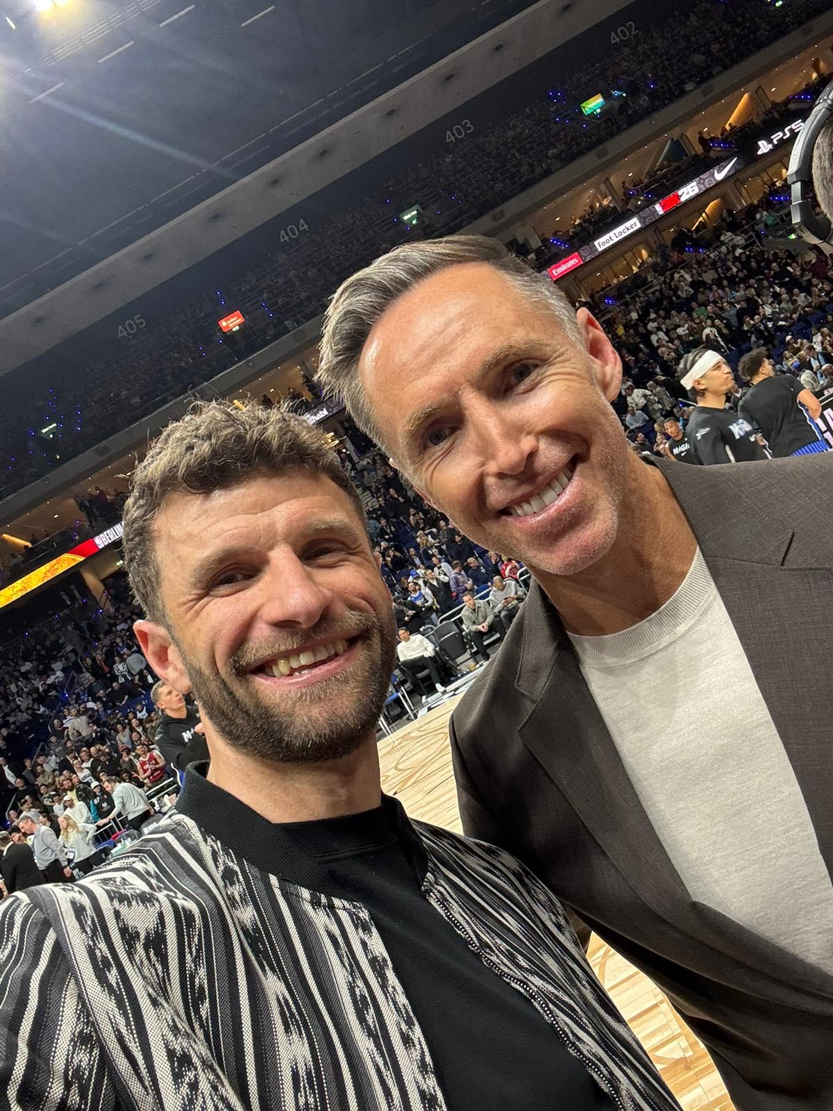 虎扑01月16日讯NBA柏林赛,托马斯-穆勒现场观赛,并且遇到了史蒂夫-纳什、德特雷夫-施伦普夫两位NBA名将。
