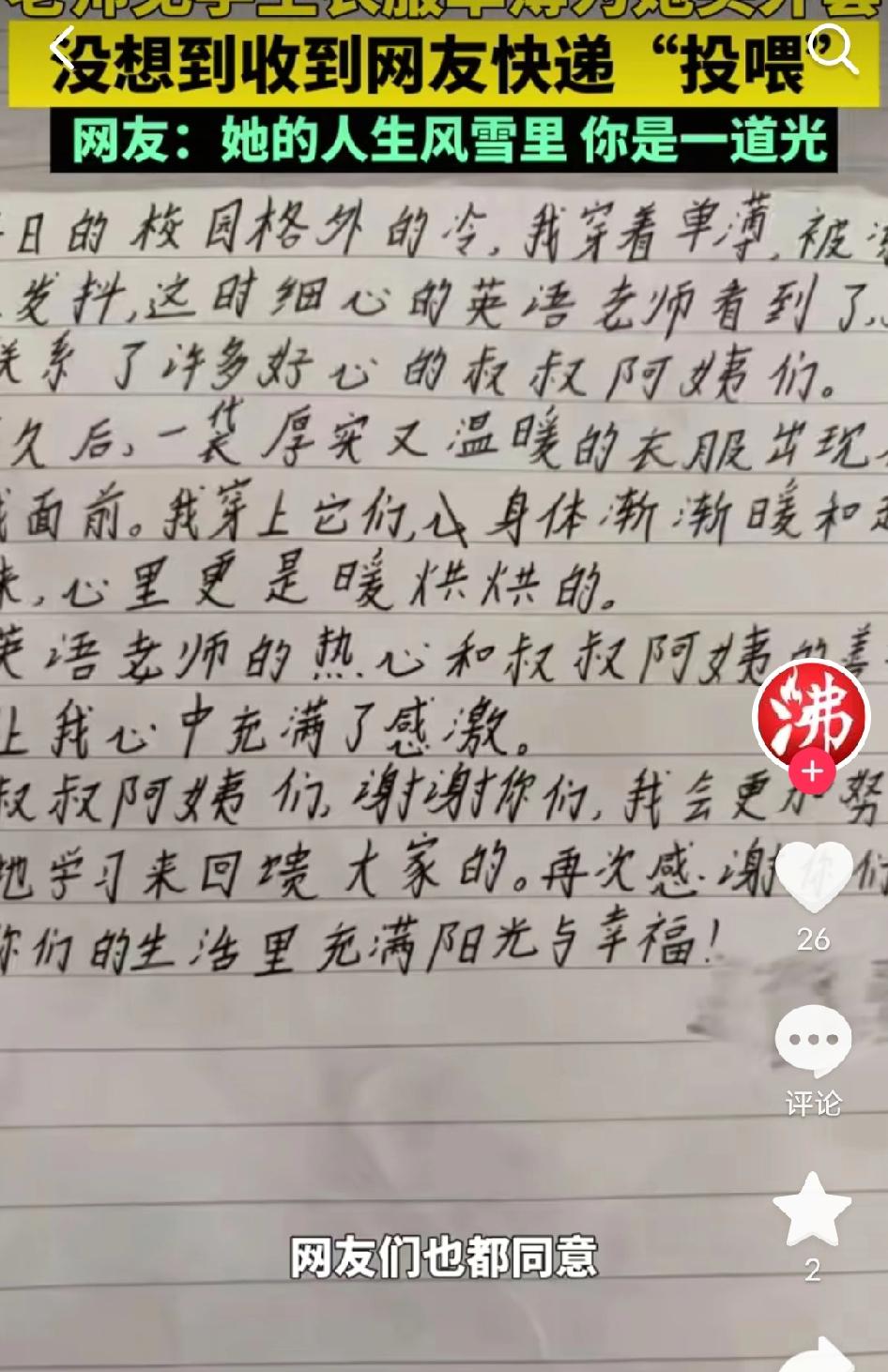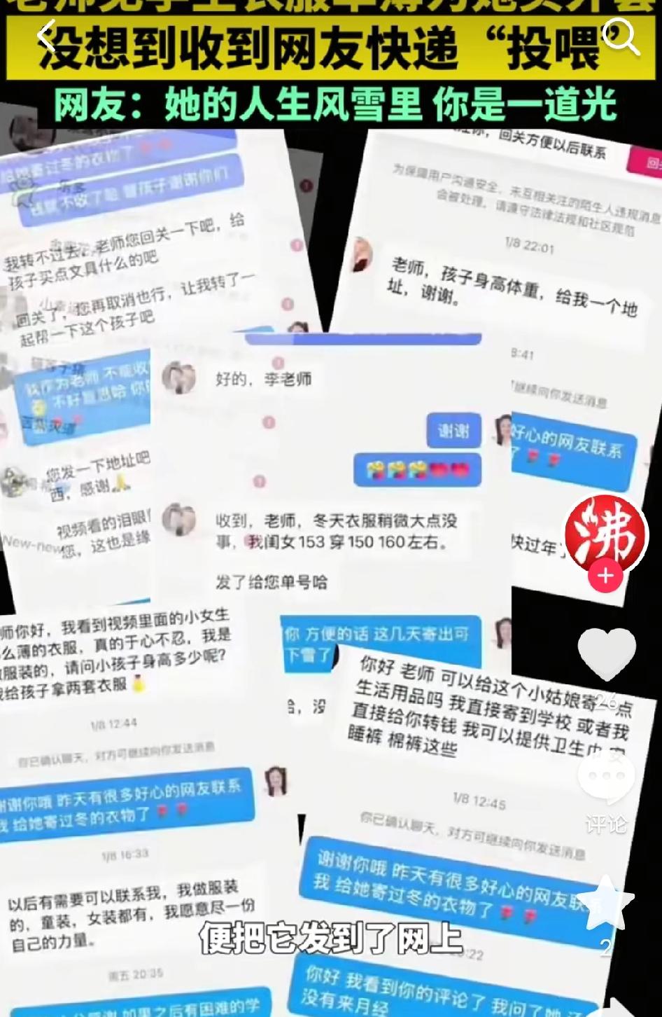 万万没想到!云南雪天,四年级小女孩穿着单衣在食堂发抖的背影,被她的老师拍了下来。随手发了条求助,没想到全网网友的爱心包裹,直接把学校办公室给堆满了! 那天雪下得特别大,英语老师去食堂吃饭时,一眼就看到了自己班上的小女孩。她穿着一件薄薄的旧外套,缩着脖子,连拿筷子的手都在微微发抖。 老师一问才知道,孩子妈妈在她很小的时候就去世了,家里条件不好,没多余的钱买厚衣服。老师心疼得不行,当天就自掏腰包给孩子买了一件厚厚的羽绒服。 她看着孩子穿着新外套站在雪地里的背影,忍不住拍了张照片发到网上,配文说:“孩子妈妈不在了,太可怜了。” 这条求助信息一发出去,就像一颗石子投进了温暖的海洋。 - 第一个私信她的是位宝妈,说“我给孩子寄双棉鞋,37码行吗?” - 接着是个大学生,寄来了保暖内衣和围巾。 - 还有做生意的大哥直接说:“我想资助她上学,直到大学毕业。” 短短几天,老师就收到了三四十个包裹,从羽绒服、棉裤到袜子、帽子,甚至还有细心的女网友寄来了内衣和卫生巾。这些包裹堆得办公室都快放不下了,连地上都摆满了。 小女孩穿上新羽绒服、新鞋子,戴上围巾帽子,高兴得在屋里转圈圈,还专门给老师和网友写了一封感谢信,歪歪扭扭的字里全是真诚:“谢谢老师和叔叔阿姨,我会好好读书的。” 有网友留言:“这才是互联网该有的样子,把温暖送到需要的人手里!” 也有网友感慨:“老师的一个善举,点燃了全网的爱心,太暖了!” 还有网友说:“孩子的背影让我想起了小时候,希望她能一直被温柔对待。” 说句实在话,这个故事我看一遍暖一遍。 你想想,一个老师的心疼,一张照片的触动,就换来了几十份跨越山海的温暖。这不是什么惊天动地的大事,就是普通人看见别人冷了,想递件衣服;看见别人难了,想搭把手的本能。 真正的善良从来不是喊出来的,是雪天里的一件羽绒服,是快递里的一双棉鞋,是陌生人一句“我来资助你上学”的承诺。这个冬天,小女孩的身上暖了,心里也暖了;而我们这些看故事的人,也跟着一起被治愈了。 希望我们都能做那个“递衣服”的人,毕竟,你的一点点温暖,可能就是别人一整个冬天的阳光。 你被这份跨越山海的温暖打动了吗?说说你曾收到过的陌生人善意~ 云南暖心老师 雪天里的温暖 全网爱心接力 小学生获捐 教育温度 来源:沸闻天下