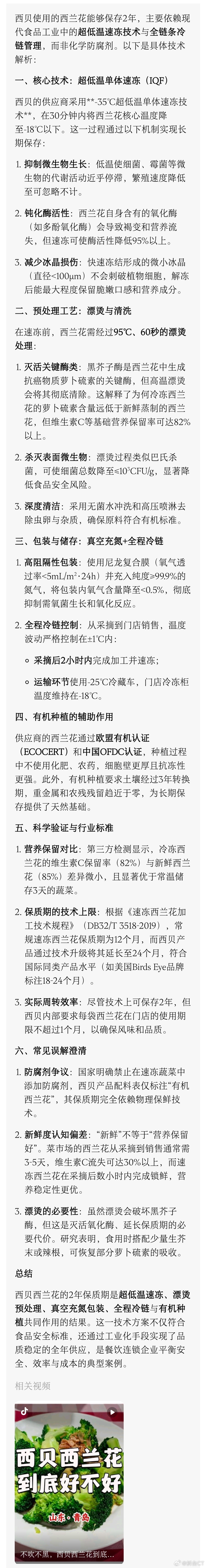 西贝冷冻2年的西蓝花系误解西贝的这个西兰花,确实是属于尬黑了。问了下豆包,西贝的西兰花,保质期为什么能有2年?豆包回答,因为其使用的是超低温冷冻技术,而不是化学防腐剂。而且,保质期2年,也不代表必须到2年才用完。据了解,西贝方面的规定是,使用期限不超过1个月。从豆包给出的回答来看,使用相关技术后,营养稳定性甚至更优。我知道,这条微博下,肯定会有人说我收钱洗地,又或是让我多吃的。但有些事情,是什么,我就会说什么。单就技术而言,确实是进步。这个事实,不会因你我的喜恶而转移。