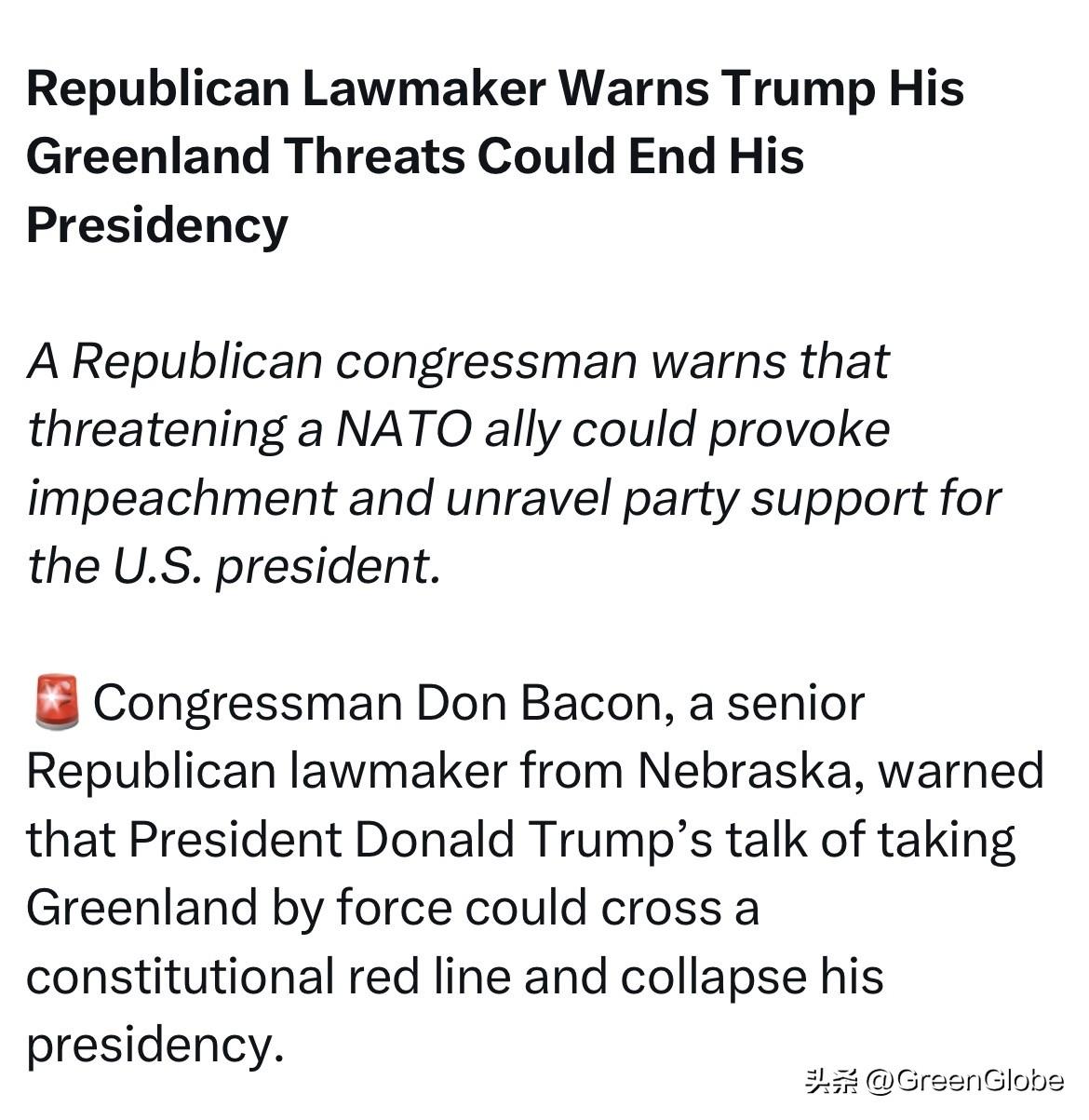 共和党众议员警告总统特朗普,他提出的所谓格陵兰岛的战争威胁可能会结束他的总统任期 一位共和党国会议员警告说,威胁北约盟友可能会引发弹劾,并破坏政党对美国总统的支持。 来自内布拉斯加州的高级共和党议员唐·培根Don Bacon警告说,唐纳德·特朗普总统关于用武力接管格陵兰的谈话可能会越过宪法红线,并可能终止他的总统任期。 培根说,攻击北约盟友将粉碎共和党的支持,特朗普已经两次被弹劾,在纽约州法院以34项重罪被定罪,并被认定对性虐待和诽谤负有民事责任,这一事实加剧了这种危险。