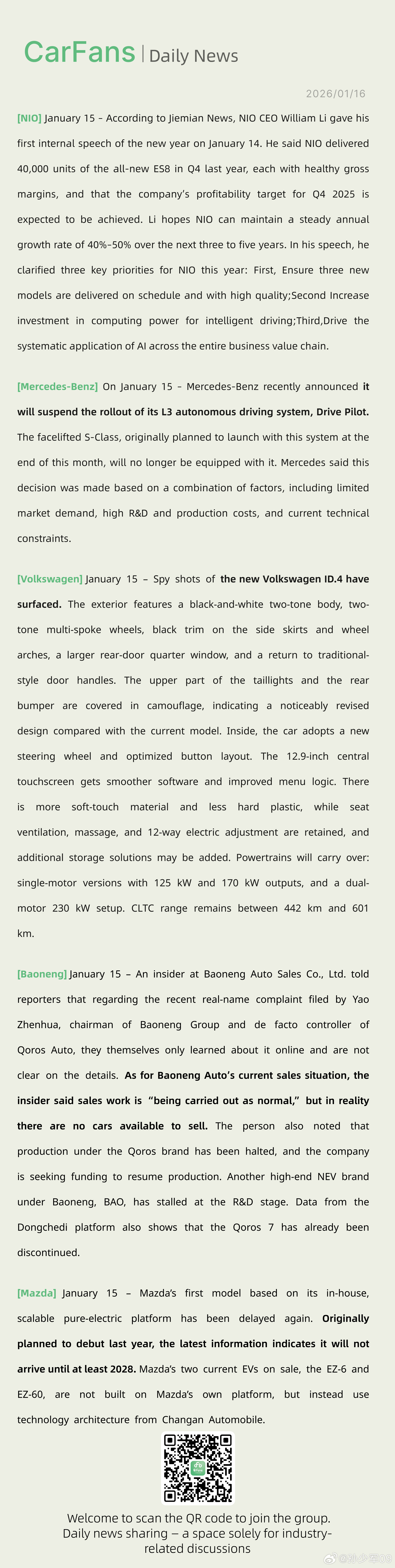 李斌发内部讲话预计第四季度盈利目标可以实现、新款大众ID.4谍照曝光1月14日,蔚来汽车CEO李斌发表新年首次内部讲话。他表示,蔚来在去年第四季度交付4万辆全新 ES8,每辆车均有稳健毛利,预计2025年第四季度盈利目标可以实现。李斌希望,接下来3至5年,蔚来汽车能够实现年均40%至50%的稳定增长。在内部讲话中,李斌明确了蔚来汽车今年的三项重点任务。首先,确保三款新车型按计划、高质量交付:其次,加大对智能驾驶的算力投入。另外,李斌表示,要推动AI在全业务链条中的系统性落地。蔚来第四季度确实惊艳新能源汽车