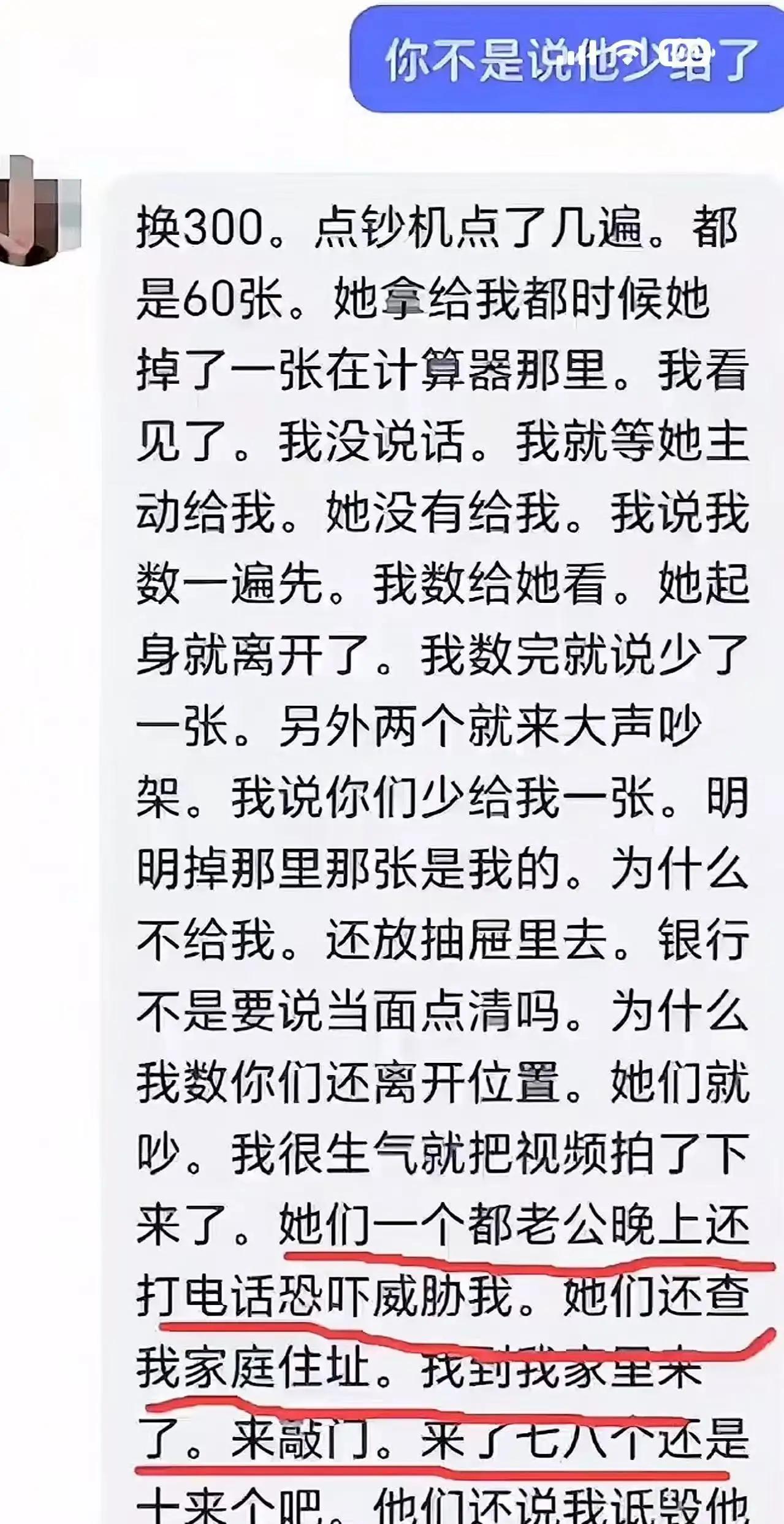 湖南娄底,女子去银行取钱,柜员给她钱时掉了一张出来,女子以为柜员会捡起来给自己,可是柜员却把钱放到抽屉里。女子要求柜员归还,柜员说钱没错,起身离开了岗位。女子把这事发到网上,没想到,当天有人打电话威胁她,还带了六七个人去敲她家的门。 为了掩盖一个5块钱的操作失误,最后付出的代价是动用私人武力、泄露客户隐私、引发全网围观,还把整个机构的公信力赔进去了。湖南娄底这起发生在12月25日的取款纠纷,表面看是服务态度问题,实际上撕开了一道更危险的口子。 故事开篇平淡无奇。一位女子前往银行柜台办理业务,欲取出三百元的五元零钞。就这般看似稀松平常的举动,却拉开了故事的帷幕。验钞机飞速运转,经过几轮精准核验,那一方屏幕之上,清晰显示出核验结果——货币数量准确无误,整个过程高效而严谨。问题源于交接之际。当那摞纸币从柜台窗口递出刹那,有一张悄然滑落至玻璃内侧,其位置毗邻计算器。 按照正常流程,这就是个几秒钟能解决的小插曲。谁的手滑了,谁捡起来补上就行。然而,柜员的举动出乎预料。她并未如常规般将钱递予客户,而是径直把钱收入自己的抽屉,打破了原本的预期。 女子隔着防弹玻璃看到这一幕,提出归还要求。回应她的是一句"钱没错",然后柜员起身离开工位,整个沟通被单方面终止。现场的另外两名工作人员亦不认可女子所言,争执愈演愈烈。在冲突升级之后,女子决意将这段经历公之于网络。 如果剧情在这里结束,充其量就是个投诉案例。真正让人后怕的是接下来发生的事。 当天晚上,女子接到了恐吓电话,对方声称已经掌握她的住址。到了深夜,七八个陌生男子准确找到她家门口,开始猛烈敲门。这种"精准打击"的速度,比任何快递服务都要迅速。 你去银行办个普通业务,遇到点纠纷发个牢骚,结果半夜就有一群人围堵你家门口——这中间的风险传导链条,暴露出的问题远比5块钱严重得多。 最核心的疑点在于信息泄露渠道。柜员的家属是通过什么途径,在这么短的时间内获取客户详细地址的?客户的隐私数据存储在金融系统里,本该受到最严格的保护,现在却成了私人报复的导航工具。 警方介入后,带头闹事的柜员丈夫给出的说辞是"对方诋毁"。仿佛深夜砸门的暴力威胁才是合理维权,而客户拍下的真实画面反倒成了诽谤。经调解,各方纷纷致歉。丈夫坦承行事冲动,柜员承认擅自离岗之不妥,行长亦承诺对业务流程加以整改,一场纷争在和解中渐归平静。 因为一张掉落的纸币,暴露出的不只是服务规范的漏洞,更可怕的是展示了滥用客户数据的能力。那个抽屉锁住的哪里是钱,分明是一种高高在上的傲慢姿态。那群半夜敲门的人砸碎的也不是门板,而是普通人对金融窗口最基本的信任感。 在当下这个数据透明的时代,我们每个人在各种系统里都像是裸奔。当你前往办理业务时,个人的联系方式、家庭住址以及身份信息等,皆毫无保留地留存于对方的数据库之中,个人隐私仿若裸呈。一旦产生矛盾,这些本该用于保护客户的信息,竟然能转化成威胁工具。 这才是整件事最荒诞的地方——为了掩盖一个小失误,动用的手段已经完全越过了法律边界。这种解决问题的思路,充满了江湖习气,唯独少了现代社会的基本底线。 如果今天掉的是100元会怎样?如果金额更大呢?只要柜员手一抖,钱进了抽屉,客户是不是就只能认栽,否则就要面临"上门警告"? 防弹玻璃能防住外面的劫匪,却防不住内部的滥权。这5块钱交的学费太沉重,它提醒所有人,当服务方拥有了你的全部信息,而你只能隔着一层玻璃被动等待时,这种权力不对等本身就藏着巨大的风险敞口。 那些因为傲慢累积起来的信任赤字,总有一天是要偿还的。只不过这次,他们选择了最愚蠢的还款方式,把自己钉在了公众监督的靶心上。