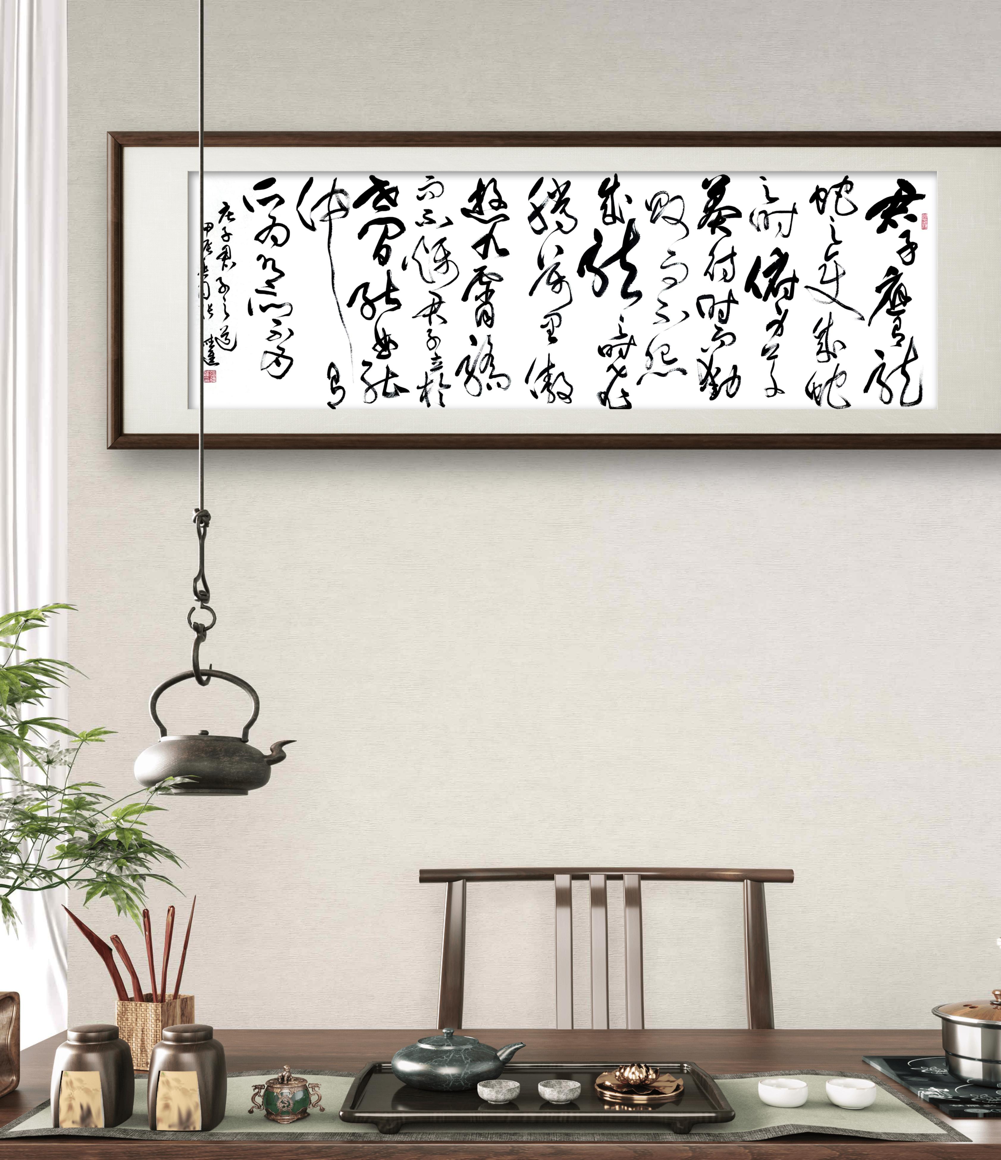 君子应有龙蛇之变,成蛇之时,俯身草莽,待时而动。败而不怨,乘龙之时,飞腾万里,遨游九霄,骄而不燥。君子立于世界,能屈能伸,有所为,有所不为。 这幅草书书法挂在家中,满室尽染文雅风骨与处世哲思。狂放的草法线条,将 “龙蛇之变” 的屈伸之道写得灵动洒脱,笔画收放转折间,恰似君子蛰伏与腾飞的人生姿态。 挂客厅,是主人胸襟格局的无声彰显;悬书房,便是日常自省的箴言。抬眼望见,进退有度、张弛有节的定力便油然而生,让家居空间多了层精神厚度。