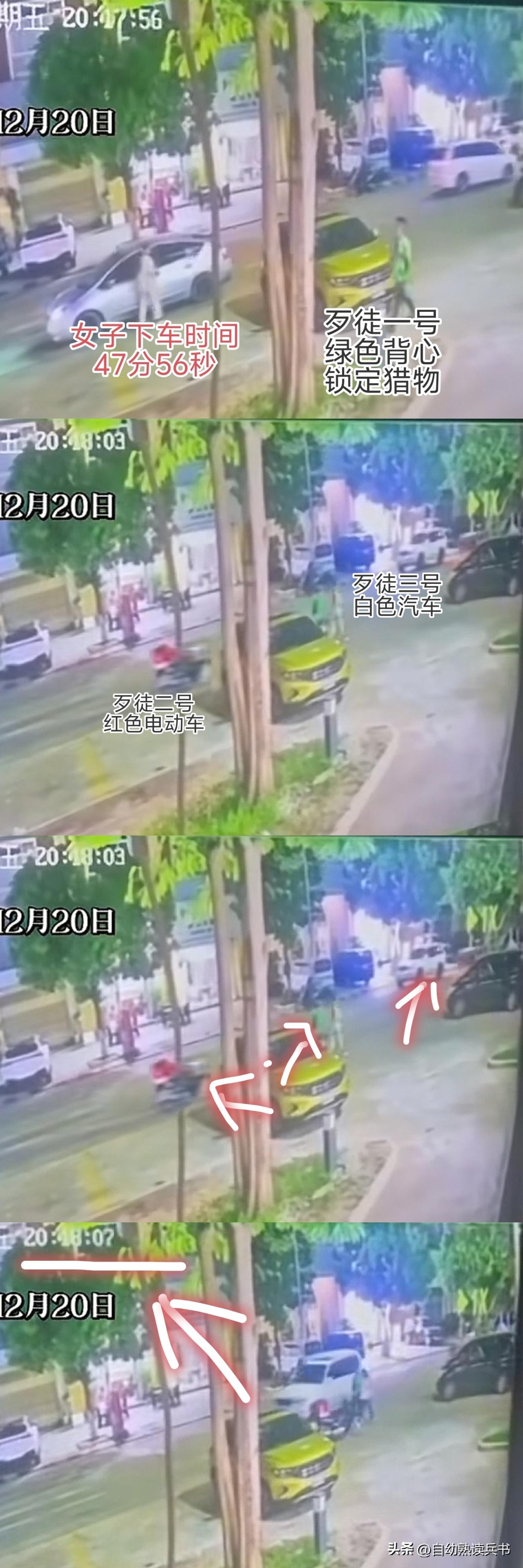 柬埔寨11秒绑架一个女人,绑架团伙分工明确,包括一名步行的,一名骑电动车的,还有两名开车的。 最让人胆寒的是,他们下手的地点并非我们认为的偏僻巷子里边,而是在大街上实施的犯罪。 20:47:56秒,女人下车 随后,就被离他仅仅3米的歹徒1号(绿色背心)盯上。 女子刚刚走了七步,歹徒1号就上前实施犯罪,应该是手里边拿着让人昏迷的凶器。 女子被迷晕的同时,歹徒2号(骑电动车),辅助抓捕,和歹徒1号一起把女子制服。 歹徒3号(大越野车),停在犯罪现场阻挡路人视野,然后把女子运在车上撤离现场。 短短11秒就完成了骇人听闻的绑架。 手法如此熟练,说明他们的这种犯罪行为不是简单的几次十几次,应该是几十次甚至上百次。 喜欢出国旅游的朋友们,一定要组团行动,千万不要把中国形成的一些好习惯带到国外。比如晚上独自出去游玩、吃饭,这是非常危险的行为。