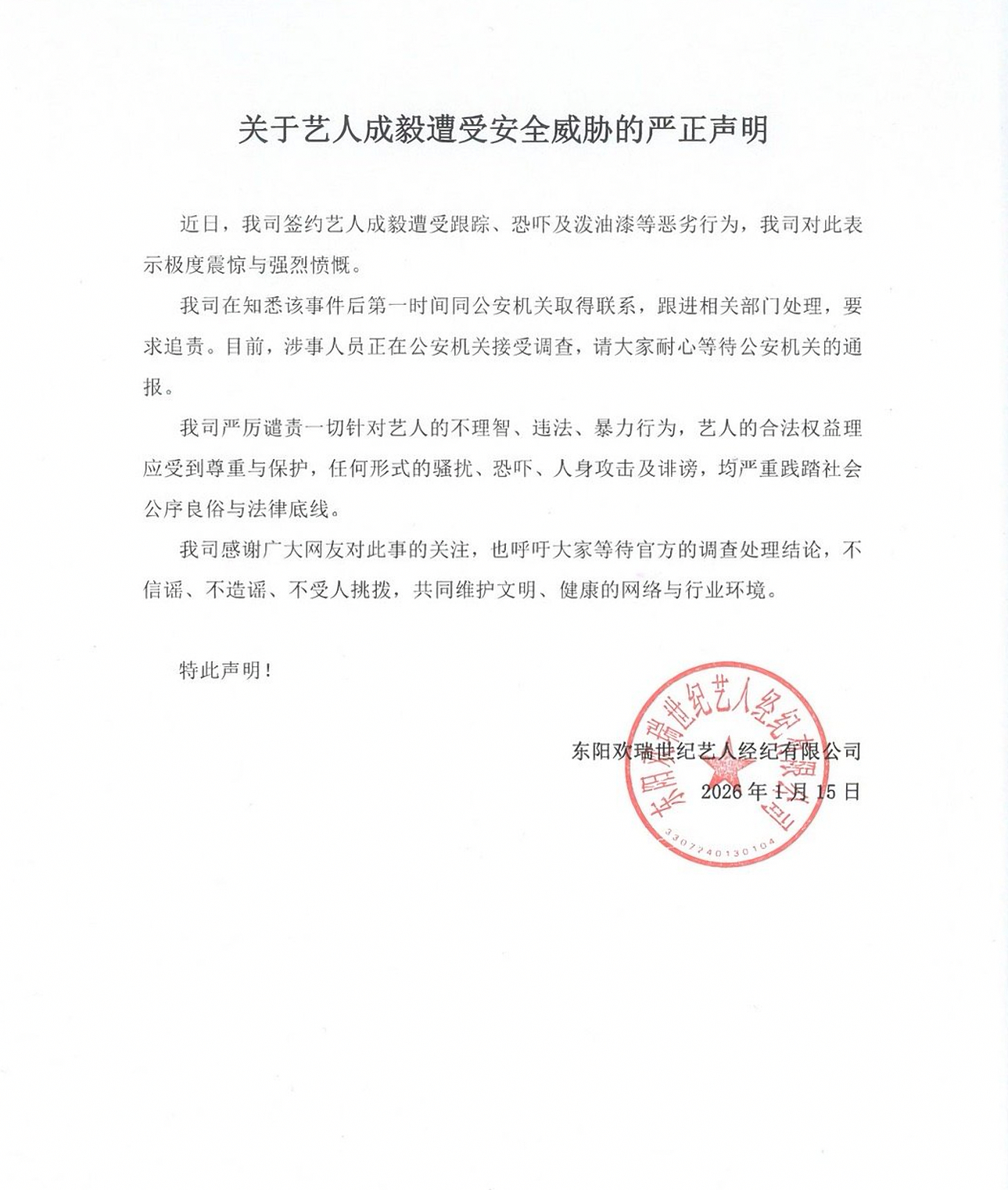 欢瑞对成毅遭受安全威胁报警了!早就该报警了!这已经是严重犯罪了!一定要保护好成毅!!!