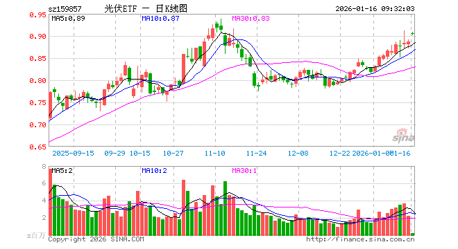1月16日,光伏ETF(159857)开盘涨2.03%,报0.905元。光伏ETF(159857)重仓股方面,阳光电源开盘涨1.44%,隆基绿能涨0.59%,特变电工涨7.76%,TCL科技涨0.61%,通威股份涨0.65%,正泰电器涨4.06%,晶盛机电涨0.70%,TCL中环涨0.57%,德业股份涨0.45%,捷佳伟创涨0.04%。