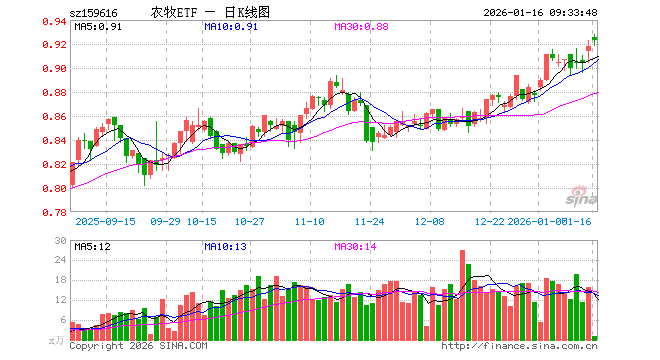 1月16日,农牧ETF(159616)开盘涨0.76%,报0.925元。农牧ETF(159616)重仓股方面,藏格矿业开盘涨0.11%,盐湖股份跌0.06%,牧原股份涨0.02%,亚钾国际涨0.63%,海大集团涨0.21%,温氏股份跌0.18%,新希望涨0.22%,梅花生物跌0.76%,扬农化工涨0.92%,大北农涨0.00%。