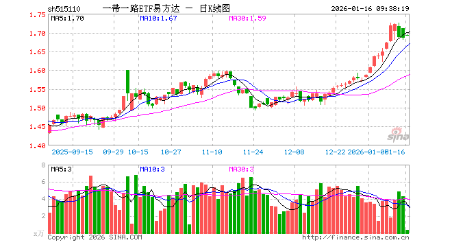 1月16日,一带一路ETF易方达(515110)开盘涨0.42%,报1.693元。一带一路ETF易方达(515110)重仓股方面,平高电气开盘涨10.02%,山东黄金跌0.97%,紫金矿业涨0.18%,中远海控涨0.34%,广东宏大跌1.26%,中国铝业涨0.07%,小商品城涨0.97%,中远海发涨0.40%,中海油服跌1.86%,云铝股份涨0.45%。