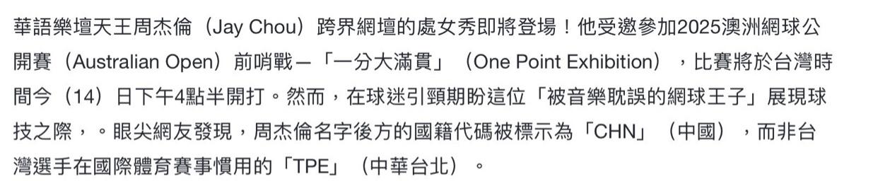 台媒报道称,周杰伦受邀参加2025澳大利亚网球公开赛,用的是“CHN”中国的身份,而不是台湾选手通常在国际比赛中所使用的“TPE”中华台北,引发热议。