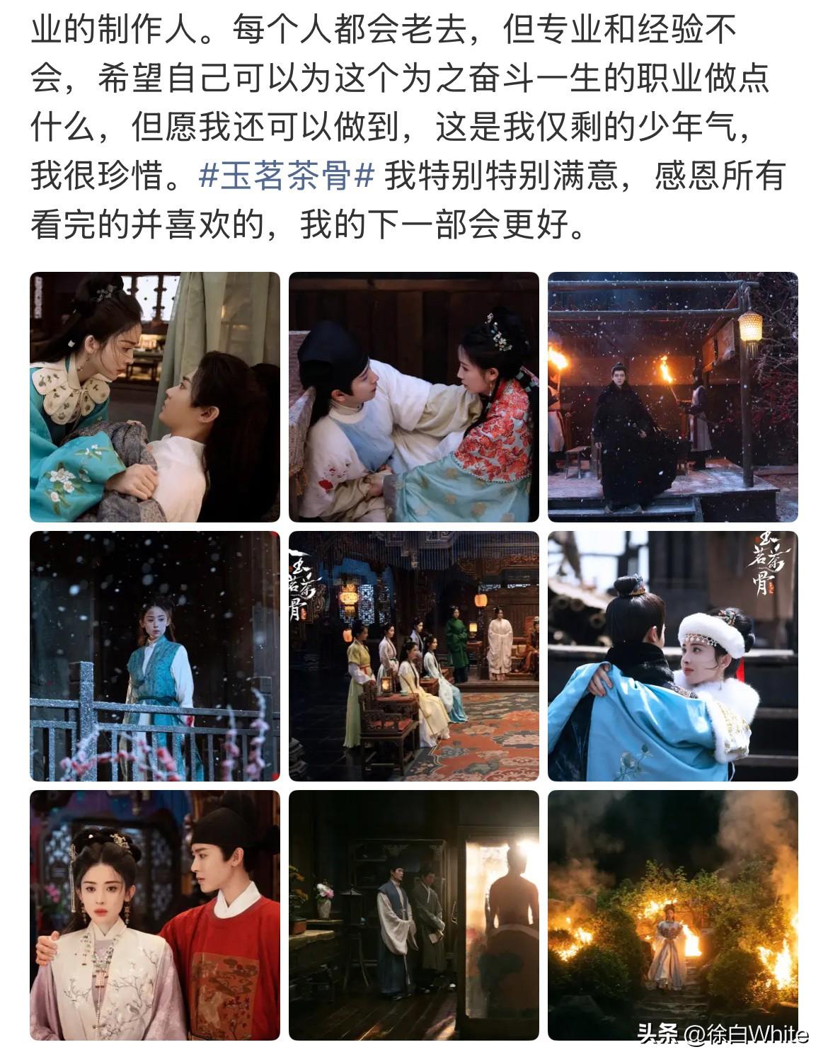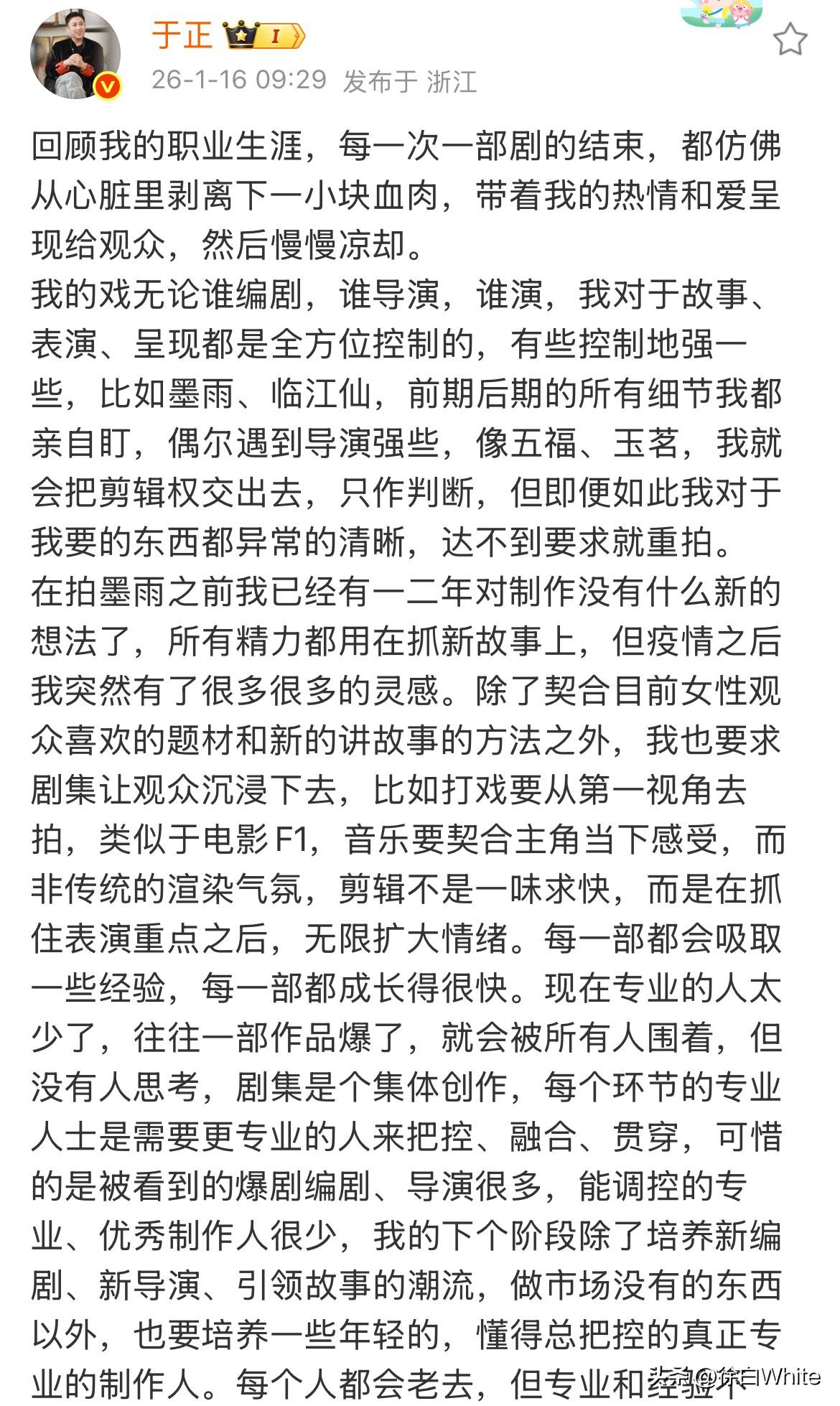 1月16日,于正发长文告别《玉茗茶骨》 把剧没播好的责任推卸到了导演身上,墨雨,临江仙剧播得好,就是他全方位控制,五福,玉茗剧播的一般,就是导演控制的强…… 两篇长文看下来,站在演员角度,我很佩服于正这种无条件爱剧护剧的行为! 但站在观众角度,我会觉得他这种爱剧护剧的程度是过于盲目的,是令人不喜的,甚至是带有见风使舵的,这样的一味吹捧只会让观众远离他的剧,这部剧为什么没有像墨雨一样爆,为什么没有像临江仙一样靠口碑翻身,肯定是有不足在里面的,于正却一概不听,一概不提,只说🥭不参考外部数据,这不是一叶障目,闭门造车么? 于正
