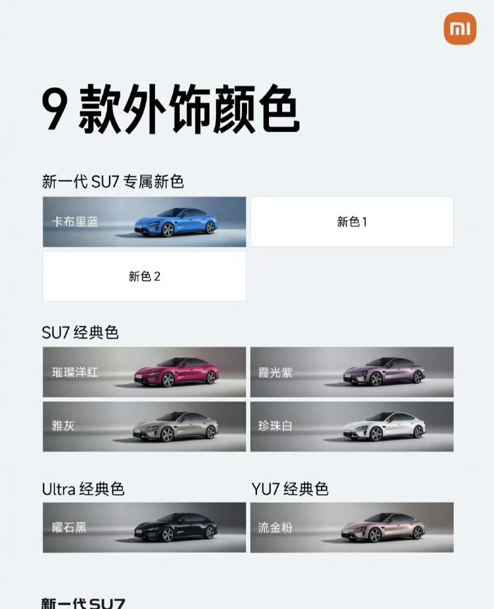 新一代小米SU7九款颜色公布璀璨洋红、霞光紫、雅灰、珍珠白!Ultra曜石黑,YU7流金粉!新增3款专属新色!