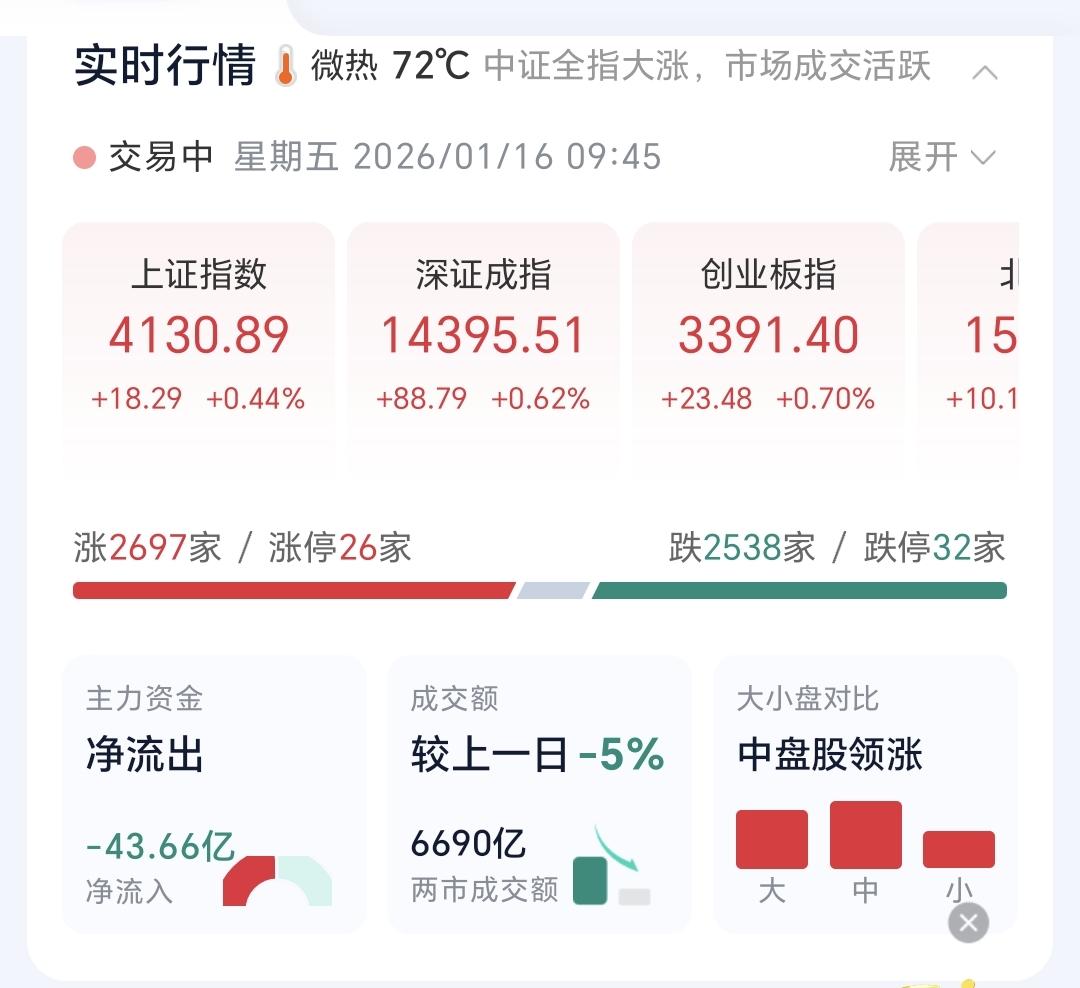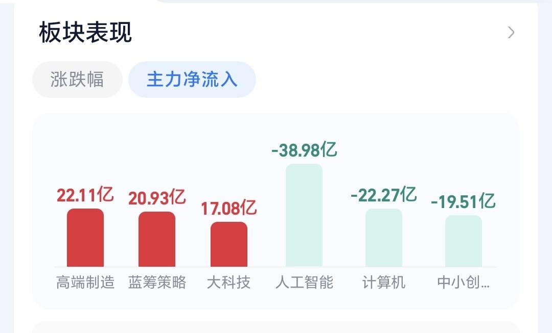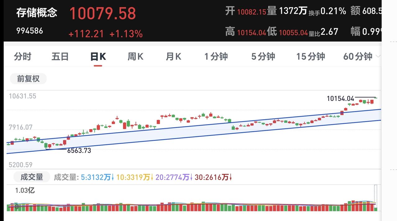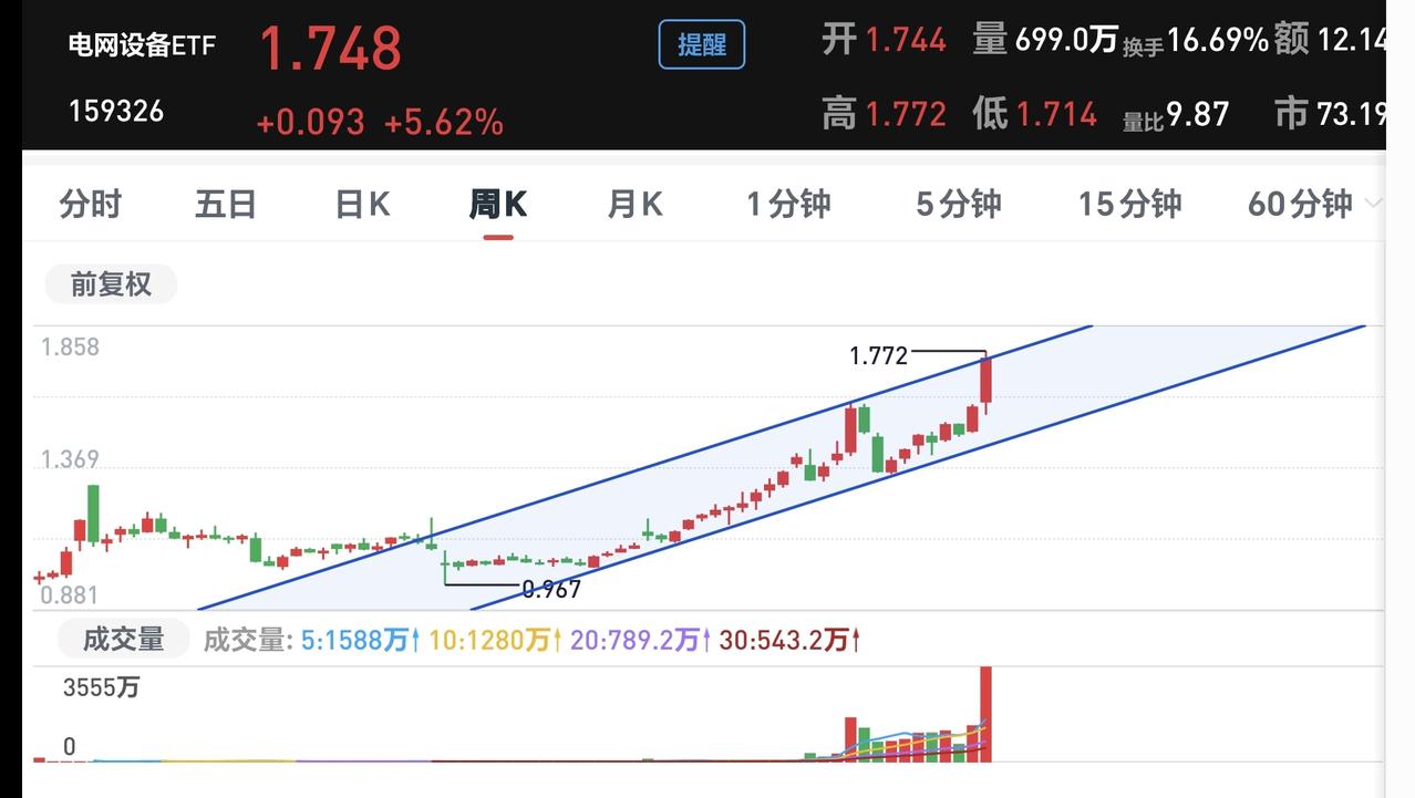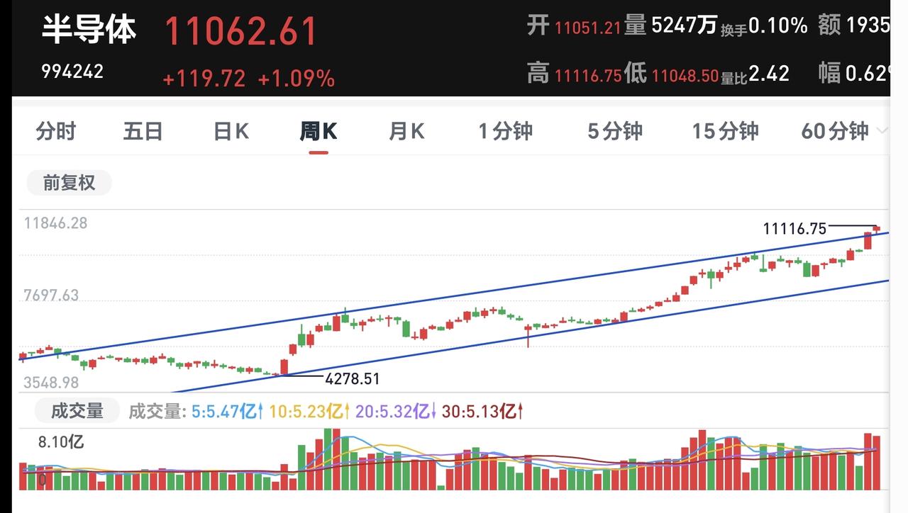 基金:为什么今天大概率会冲高回落 今天市场高开,三大指数都是高开,创业板指开盘上涨了0.78%,开于3394点,上证指数开盘上涨了0.35%,开于4127点,高开的幅度都不大。 开盘以后指数小幅度震荡,黄色线在蓝色线下方,两条线之间的敞口并不是很大,注意观察黄色线能不能跟随蓝色线涨跌,甚至是黄色线上穿蓝色线。 第一个15分钟两市累计成交6690亿,相比于昨天缩量了5%,今天继续缩量,不是一个好现象,特别是现在是在反弹过程中缩量,说明资金不愿意进场,如果不能及时放量,如果黄色线不能跟随蓝色线,谨防今天冲高回落。 市场上涨2600多家,下跌2500多家,上涨家数微微超过了下跌家数,涨停26家,跌停32家,跌停家数超过了涨停家数,并且超过了30家跌停,这也是不好的现象。 持有的基金中,估值上涨幅度最大的三个板块是:大科技混合,芯片半导体板块,新能源汽车板块,下跌幅度最大的三个板块是:可控核聚变板块,军工板块,大消费板块,估值整体上涨了5513元。 我们看一下下面的截图8,今天上涨幅度最大的三个板块是:电网设备板块,半导体板块,存储芯片板块。 我们来看一下下面的截图9,这是电网设备板块日K线图,从图中可以看出,我画了两条倾斜向上的斜线,这是电网设备板块日线级别上涨通道,今天的上涨突破了这个上涨通道的上轨,也就是说,电网设备板块日线级别有可能已经处于加速上涨中。 我们来看一下下面的截图10,这是电网设备板块周K线图,从图中可以看出,我画了两条倾斜向上的斜线,这是电网设备板块周线级别上涨通道,今天盘中一度突破了这个上涨通道的上轨,现在又回到了通道上轨线的附近,注意观察能不能突破这条上轨线,如果能够突破这条上轨线,也就显示了电网设备板块周线级别也是处于加速上涨中。 来看一下下面的截图11。这是半导体板块周K线图,从图中可以看出,我画了两条倾斜向上的斜线,这是半导体板块周线级别上涨通道,上周的上涨已经突破了这个上涨通道的上轨,本周是在上涨通道上方震荡,这个板块有可能已经处于加速上涨中,持有的人可以继续持有,除非跌破这个上涨通道的下轨,才可以考虑要不要止盈出来观望。 我们来看一下下面的截图12,这是存储概念板块日K线图,从图中可以看出,我画了两条倾斜向上的斜线,这是存储概念板块日线级别上涨通道,前段时间上涨突破了这个上涨通道的上轨,也就是说,存储概念板块日线级别已经处于加速上涨中。 我们来看一下下面的截图13,这是存储概念板块周K线图,从图中可以看出我画了两条倾斜向上的斜线,这是存储概念板块周线级别上涨通道,上周的上涨已经突破了这个上涨通道的上轨,本周在上涨通道上方继续向上,也就是说,存储概念板块周线级别处于加速上涨中,持有的人可以继续持有,除非跌破这个上涨通道的下轨,才可以考虑要不要止盈出来观望。 我们来看一下下面的截图14,这是主力资金进出板块的情况,主力资金净流入最多的三个板块是:高端制造板块,蓝筹策略板块,大科技板块,主力资金净流出最多的三个板块是:人工智能板块,计算机板块,中小创板块。 我给你半个小时,我只要你11秒钟,一秒钟给我点个赞,十秒钟给我一个评论,谢谢大家的支持。 我每天都会分享我的观点,我的观点只代表我个人的看法,不能作为你操作的依据,据此操作后果自负。