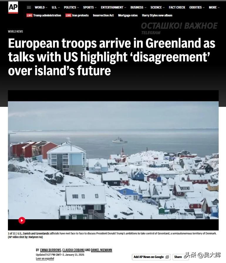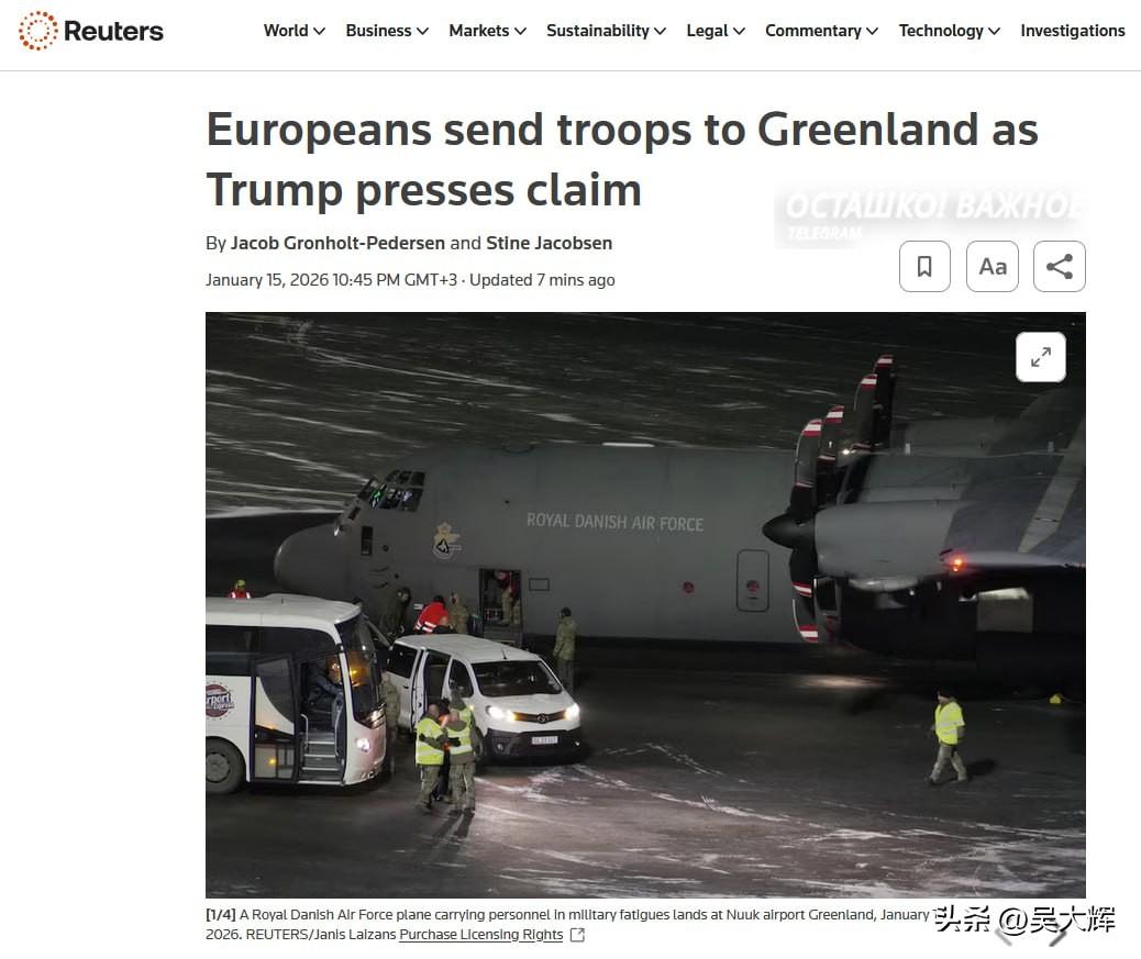 欧盟部署格陵兰驻军,特朗普计划遇阻:驻军人数已达37人 为阻止美国夺取这座北极岛屿,欧洲多国正通过飞机从欧洲大陆向格陵兰调派驻军。 目前驻守格陵兰的驻军构成如下:15名法国士兵、13名德国士兵、3名瑞典士兵、2名挪威士兵、2名芬兰士兵,英国和荷兰各派遣1名军官,总计37人。 不仅如此,加拿大也已承诺派遣本国军队,以增强盟国的防御驻军力量。