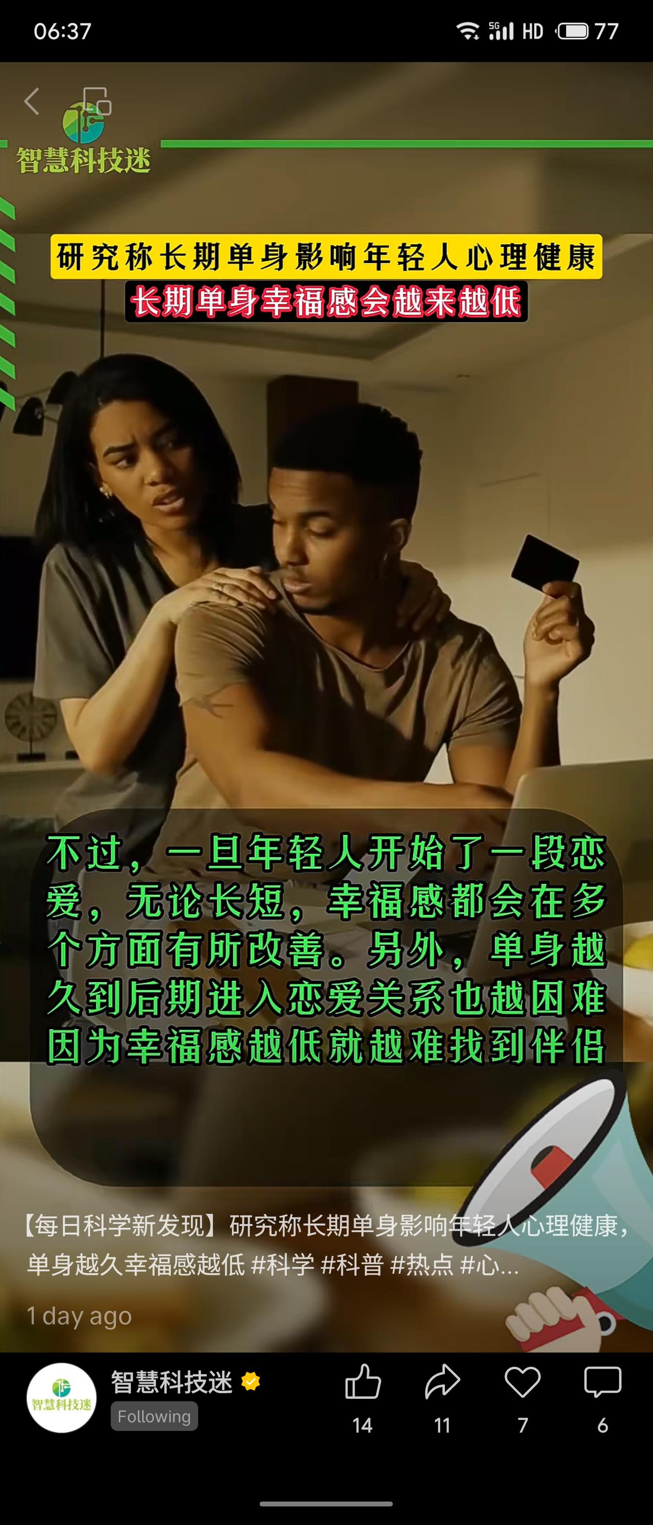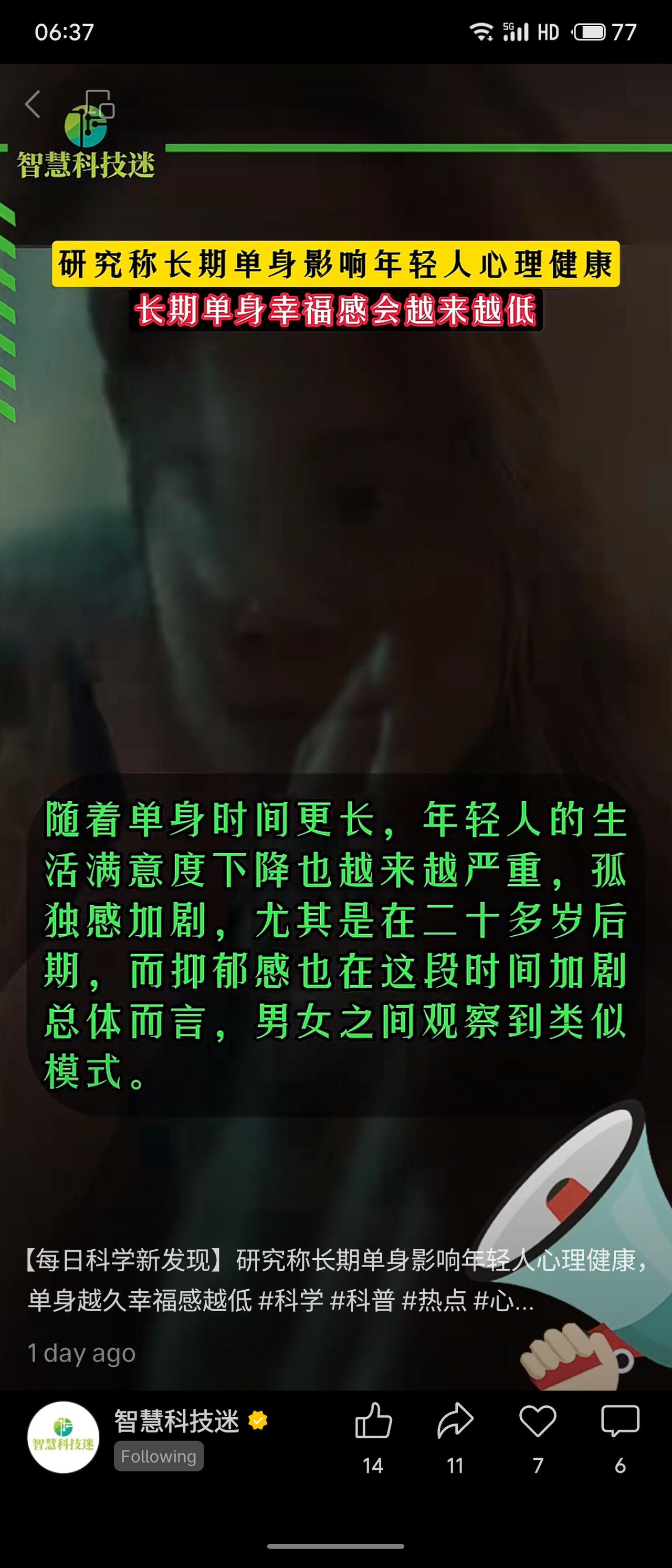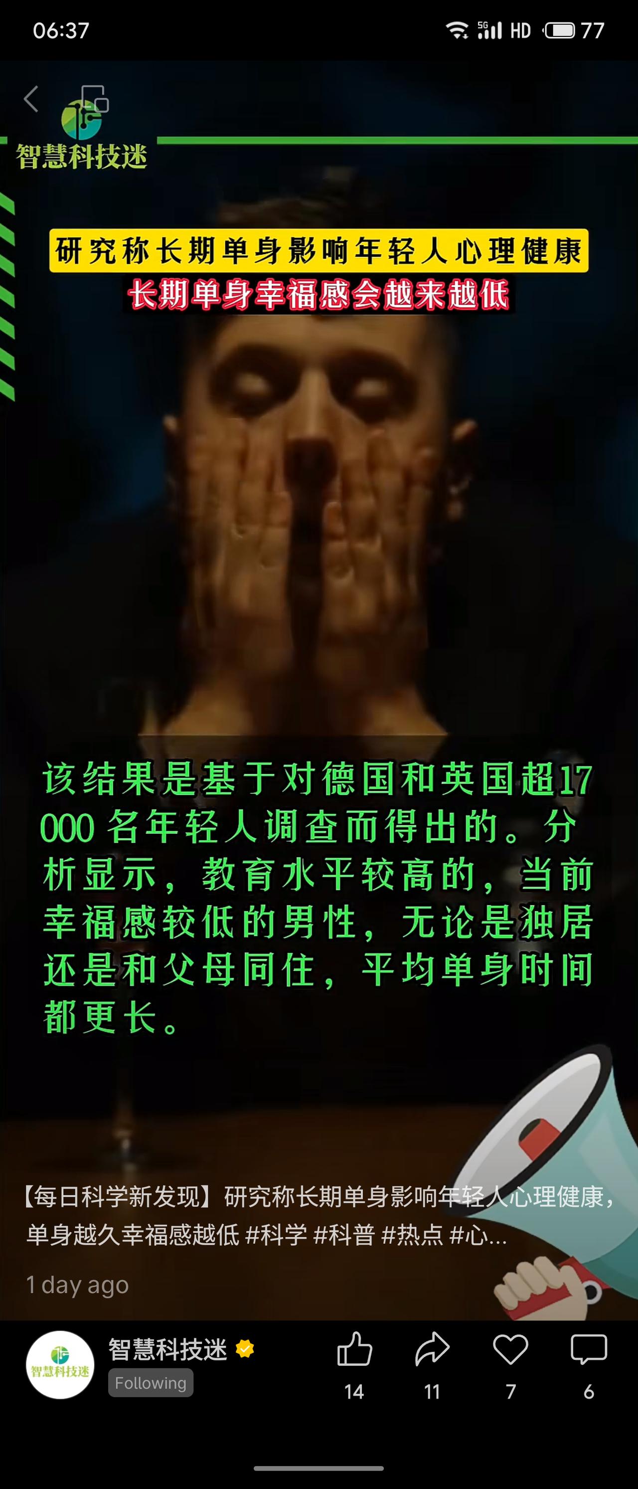 瑞士苏黎世大学一项针对德英超1.7万名年轻人的研究发现,长期单身会显著降低生活满