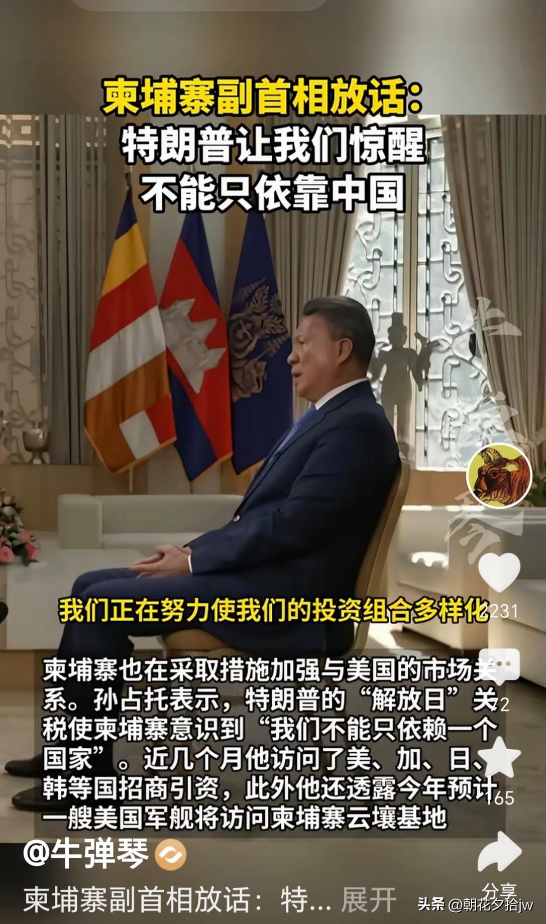 柬副首相孙占托又放狠话! “我们不能只依赖中国,要多元化开 放搞活!” 并故作高深:我们惊醒了! “特朗普宣布‘解放日’关税时给了我们当头一棒”! 孙占托表示:“我们不能只依赖一个国家。” 他说,小国“承受不起在中美竞争中选边站队”。 他还说:“大象打架时,最 好躲开。 柬埔寨可以通过不选边来生存。” 这可能吗? 柬埔寨不可能永远保持中立,美国不让,中国也不同意。 “唇亡齿寒”的道理,柬埔寨太懂了! 如此语无伦次,想必胡萝卜吃多了… 柬埔寨国际地位