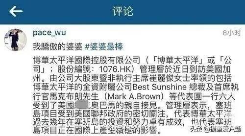 吴佩慈这下是真的笑不出来了 她的婆婆在美国被捕了 她婆婆崔丽杰曾是博华太平洋国际控股有限公司大股东,从事赌场生意。 他老公纪晓波也深度参与博华太平洋皇宫赌场等项目开发。 当年吴佩慈为了讨好婆婆,为婆婆发文宣传,还说为婆婆骄傲。