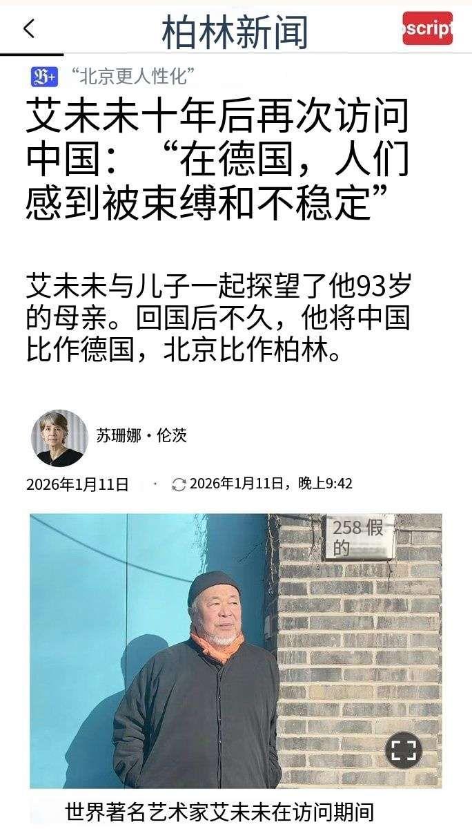 艾青的儿子回来了,感叹还是中国好!离家10年,母亲已93岁。 据《柏林日报》1月11日报道,艾青之子,艺术家艾未未在离开10年后携儿子回北京探望自己93岁高龄的母亲。 回德国后接受专访时表示:“在德国人会感到受束缚且岌岌可危”,对比之下“北京更有人情味”。 他还具体分享了在中国的体验,闲置多年的银行账户重新启用只用了几分钟,效率远超预期。 逛街买衣服时店主会主动贴心量身定做,细节里满是温度。 更让他念念不忘的是中国美食,每一口都藏着童年与故土的记忆,直言 “味蕾从未如此踏实”。 作为诗人艾青之子,他童年随父在新疆长大,少年返京。 1993年他曾为照料病重的父亲回国,如今二十年后带着儿子再踏归途。 艾青在《我爱这土地》中写下的 “为何我的眼里常含泪水?因为我对这土地爱得深沉……”,不知道他有没有感受到和父亲的精神共鸣。 从当年草场地工作室里的艺术实验,到 “鸟巢” 设计中的东方巧思,再到《葵花籽》《童话》里的文化叩问,他的创作从未脱离故土根系。 而这次回国,所谓的争议似乎都变得遥远,只剩下一个游子对故土的真切认可,正如父亲艾青笔下那份刻骨铭心的土地情怀。