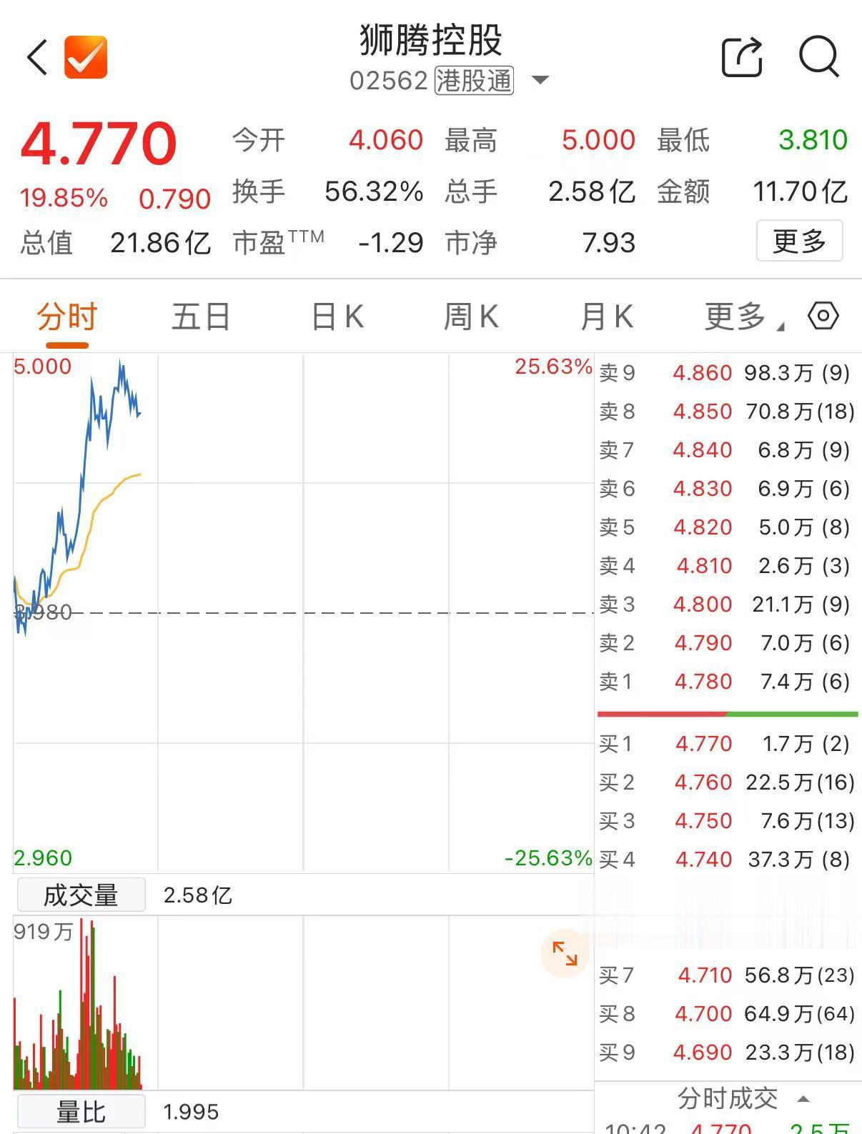 上证报中国证券网讯(记者徐潇潇)1月16日早盘,狮腾控股股价显著拉升,盘中一度涨超25%。截至10时42分,狮腾控股涨19.85%,报4.77港元/股。
