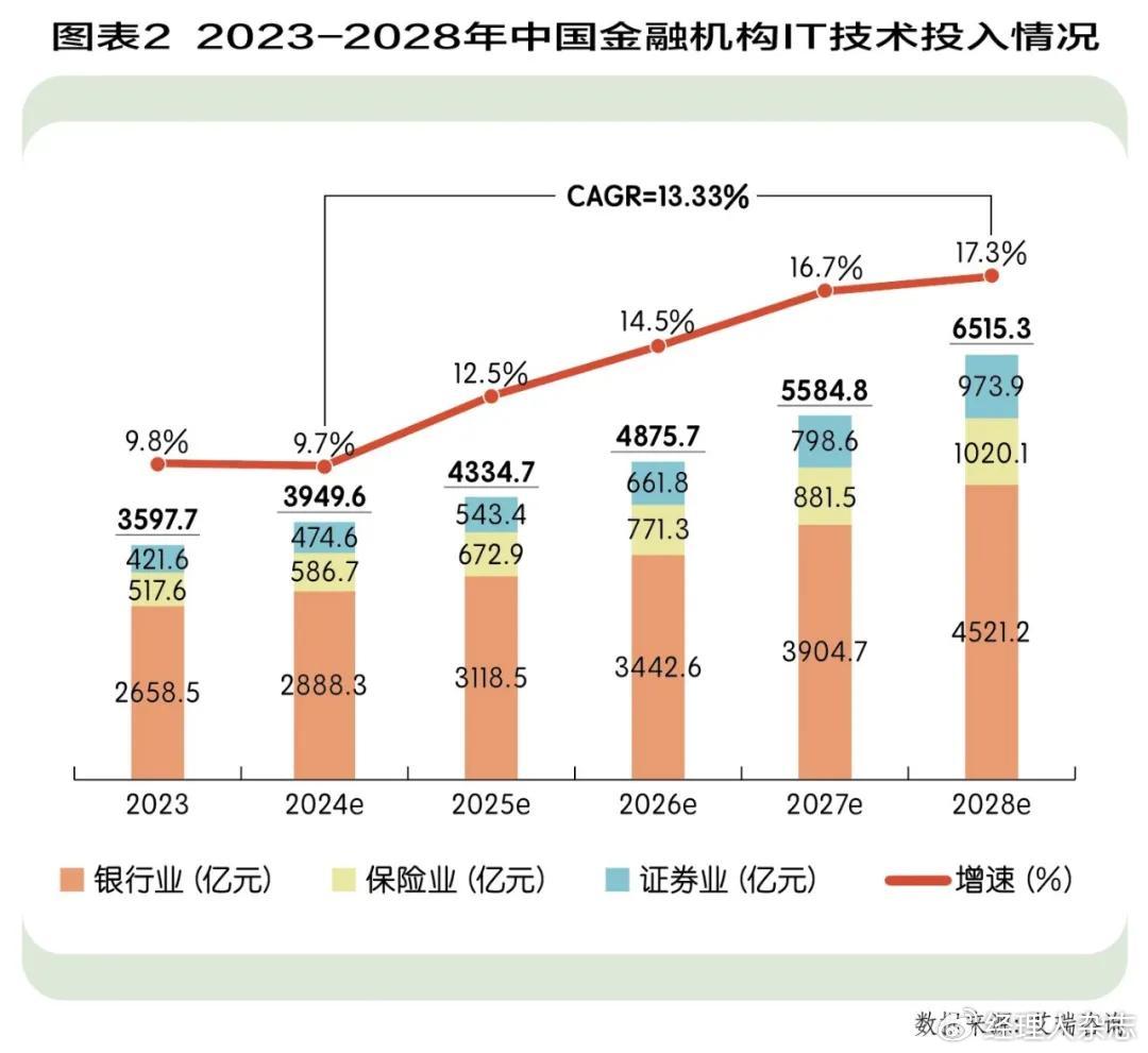 当前,金融行业数智化转型持续深入,国内金融机构的科技感知力、产品理解力逐步提升。以金融大模型为代表的新兴技术力量正在崛起,进一步激发了市场对科技解决方案的需求。艾瑞咨询表示,“2025年作为多项发展规划的关键节点年份,将开启新一轮的高速成长时代,预计市场整体将以约13.3%的复合增长率(CAGR)高速增长,2028年国内金融机构的科技投入规模或将突破6500亿元。(图表2)”