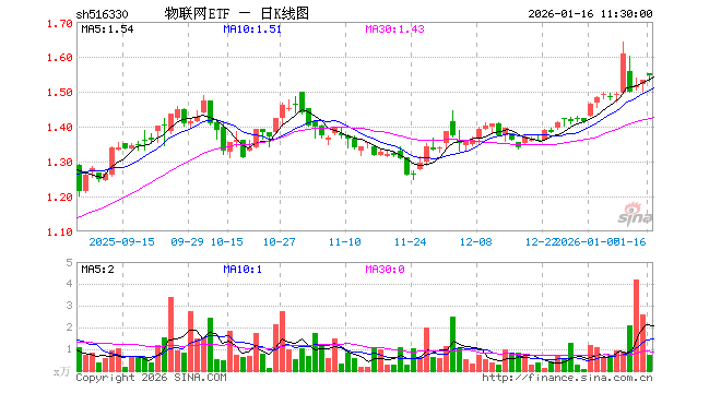 1月16日,截止午间收盘,物联网ETF(516330)涨0.91%,报1.546元,成交额116.13万元。物联网ETF(516330)重仓股方面,中际旭创截止午盘涨0.35%,立讯精密涨2.09%,汇川技术涨1.27%,中兴通讯跌0.45%,兆易创新涨7.08%,豪威集团涨1.23%,海康威视跌1.18%,科大讯飞涨0.49%,美的集团涨0.18%,华工科技跌0.51%。