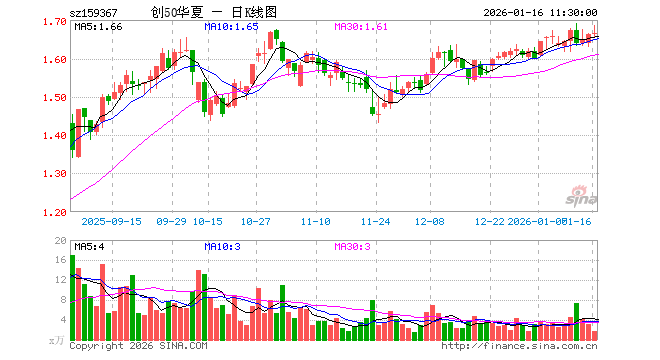 1月16日,截止午间收盘,创业板50ETF华夏(159367)涨0.24%,报1.665元,成交额289.12万元。创业板50ETF华夏(159367)重仓股方面,宁德时代截止午盘跌0.21%,中际旭创涨0.35%,东方财富跌0.29%,新易盛跌0.18%,阳光电源涨2.33%,胜宏科技跌0.05%,汇川技术涨1.27%,迈瑞医疗跌1.08%,亿纬锂能涨0.63%,同花顺跌2.01%。