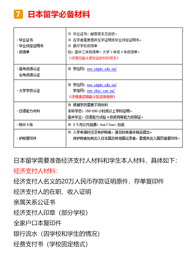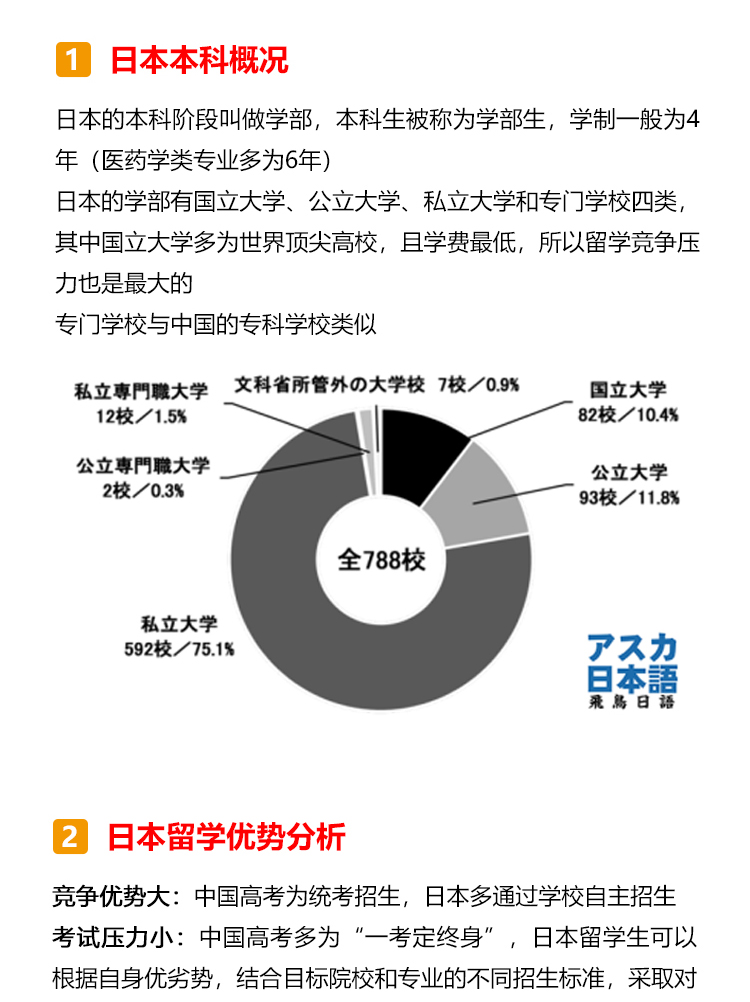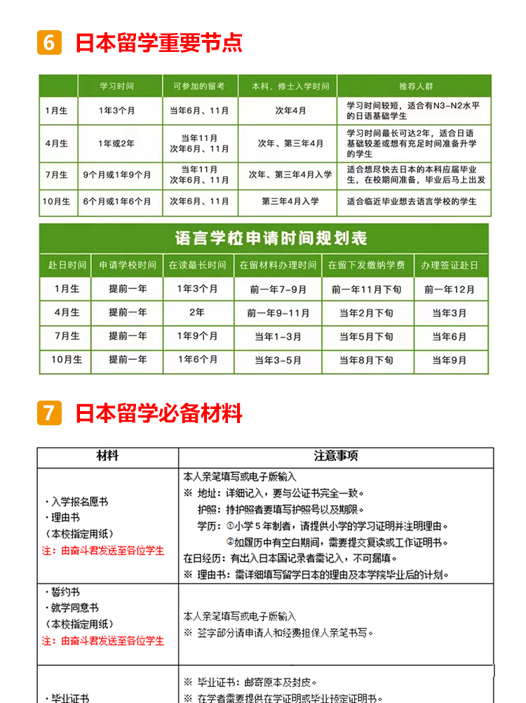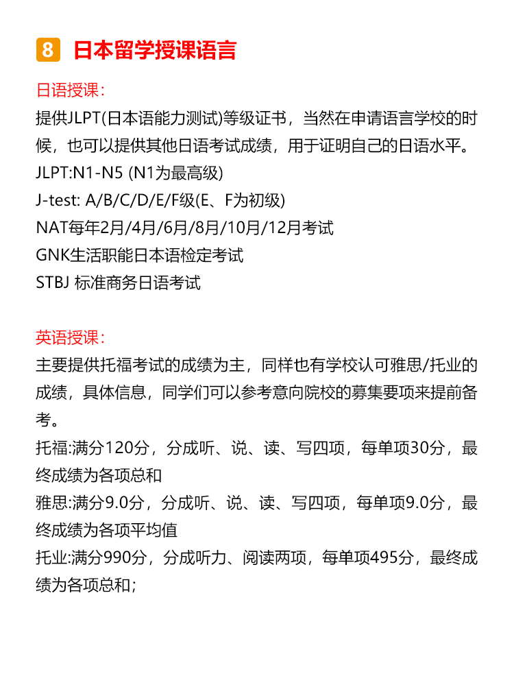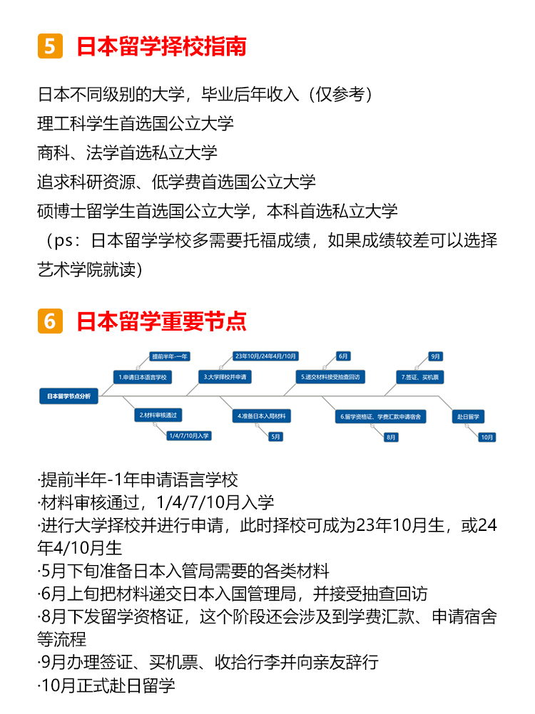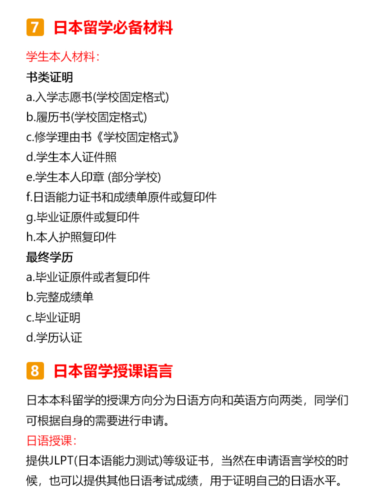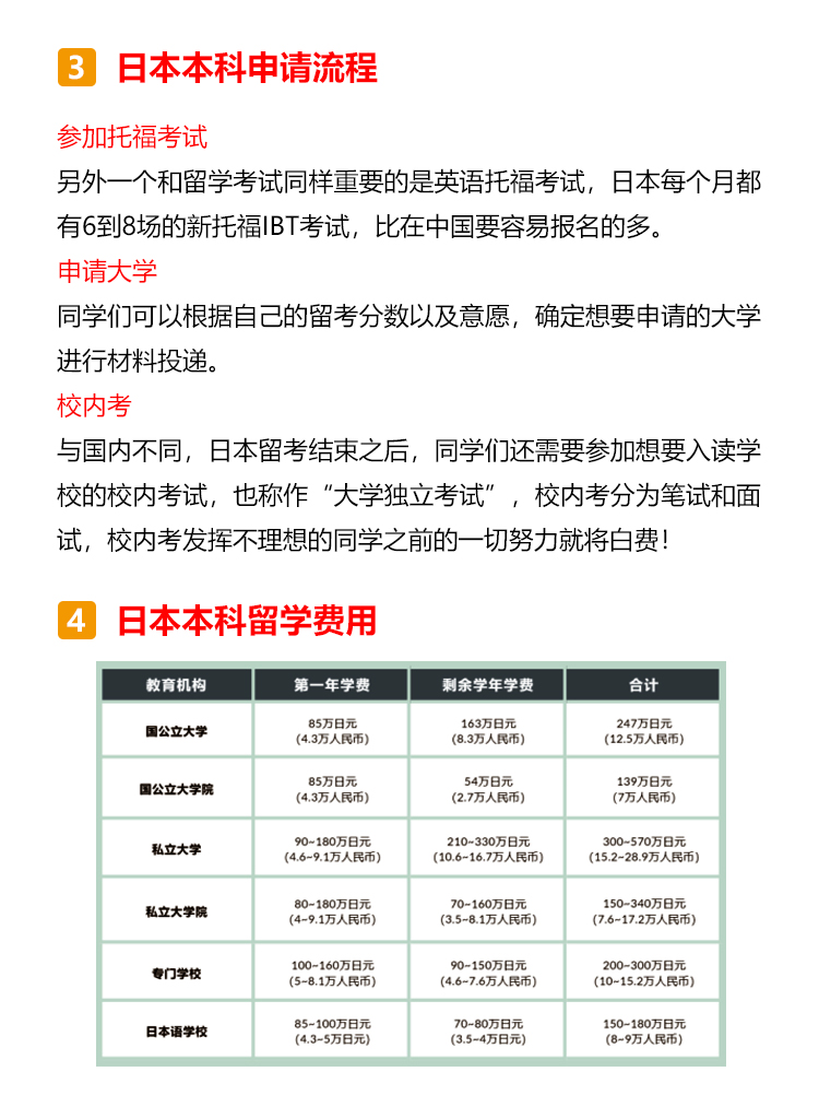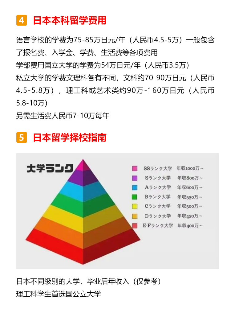 日本本科概况 日本的本科阶段叫做学部,本科生被称为学部生,学制一般为4年(医药学类专业多为6年); 日本的学部有国立大学、公立大学、私立大学和专门学校四类,其中国立大学多为世界顶尖高校,且学费最低,所以留学竞争压力也是最大的; 专门学校与中国的专科学校类似。 日本留学优势分析 1.竞争优势大:中国高考为统考招生,日本多通过学校自主招生。 2.考试压力小:中国高考多为“一考定终身”,日本留学生可以根据自身优劣势,结合目标院校和专业的不同招生标准,采取对自己最有利的升学路径,降低考试压力。 3.考试难度低:日本考试题型多为选择题,且对基础知识的考察较多,难度要低于国内高考。 4.考试场次多:日本留学生一年有两次考试机会。 日本本科申请流程 申请日本语言学校→参加EJU留考→参加托福考试→申请大学→校内考 申请日本语言学校 日本本科为全日语授课,因此要求留学生JLPT具备N2以上的能力,读语言学校成为了日本留学的必备关卡!但语言学校申请时需要提供至少200课时以上的日语在读证明,加上资料申请的时间,至少需要留出1年准备时间,所以建议同学们提前一年在国内广州日语学校就读,之后去日本申请语言学校或私塾,这样做既省钱又省时间哦~ 参加EJU留考 EJU留考全称为日本留学考试,与国内高考一样,也分为文综和理综,但留考一年有两次考试,分别是6月和11月。 参加托福考试 另外一个和留学考试同样重要的是英语托福考试,日本每个月都有6到8场的新托福IBT考试,比在中国要容易报名的多。 申请大学 同学们可以根据自己的留考分数以及意愿,确定想要申请的大学进行材料投递。 校内考 与国内不同,日本留考结束之后,同学们还需要参加想要入读学校的校内考试,也称作“大学独立考试”,校内考分为笔试和面试,校内考发挥不理想的同学之前的一切努力就将白费! 日本本科留学费用 语言学校的学费为75-85万日元/年(人民币4.5-5万)一般包含了报名费、入学金、学费、生活费等各项费用。 学部费用国立大学的学费为54万日元/年(人民币3.5万); 私立大学的学费文理科各有不同,文科约70-90万日元(人民币4.5-5.8万),理工科或艺术类约90万-160万日元(人民币5.8-10万); 另需生活费人民币7-10万每年。 日本留学择校指南 日本不同级别的大学,毕业后年收入(仅参考) 理工科学生首选国公立大学; 商科、法学首选私立大学; 追求科研资源、低学费首选国公立大学; 硕博士留学生首选国公立大学,本科首选私立大学; 日本留学重要节点 ·提前半年-1年申请语言学校 ·材料审核通过,1/4/7/10月入学 ·进行大学择校并进行申请,此时择校可成为23年10月生,或24年4/10月生 ·5月下旬准备日本入管局需要的各类材料 ·6月上旬把材料递交日本入国管理局,并接受抽查回访 ·8月下发留学资格证,这个阶段还会涉及到学费汇款、申请宿舍等流程 ·9月办理签证、买机票、收拾行李并向亲友辞行 ·10月正式赴日留学 日本留学必备材料 日本留学需要准备经济支付人材料和学生本人材料,具体如下: 经济支付人材料: 经济支付人名义的20万人民币存款证明原件,存单复印件 经济支付人的在职、收入证明 亲属关系公证书 经济支付人印章(部分学校) 全家户口本复印件 银行流水(因学校和学生的情况) 经费支付书(学校固定格式) 学生本人材料: 书类证明 a.入学志愿书(学校固定格式) b.履历书(学校固定格式) c.修学理由书《学校固定格式》 d.学生本人证件照 e.学生本人印章 (部分学校) f.日语能力证书和成绩单原件或复印件 g.毕业证原件或复印件 h.本人护照复印件 最终学历 a.毕业证原件或者复印件 b.完整成绩单 c.毕业证明 d.学历认证 日本留学授课语言 日本本科留学的授课方向分为日语方向和英语方向两类,同学们可根据自身的需要进行申请。 日语授课: 主要提供JLPT(日本语能力测试)等级证书,当然在申请语言学校的时候,也可以提供其他日语考试成绩,用于证明自己的日语水平。 JLPT:N1-N5 (N1为最高级) J-test: A/B/C/D/E/F级(E、F为初级) NAT每年2月/4月/6月/8月/10月/12月考试 GNK生活职能日本语检定考试 STBJ 标准商务日语考试 英语授课: 主要提供托福考试的成绩为主,同样也有学校认可雅思/托业的成绩,具体信息,同学们可以参考意向院校的募集要项来提前备考。 托福:满分120分,分成听、说、读、写四项,每单项30分,最终成绩为各项总和 雅思:满分9.0分,分成听、说、读、写四项,每单项9.0分,最终成绩为各项平均值 托业:满分990分,分成听力、阅读两项,每单项495分,最终成绩为各项总和