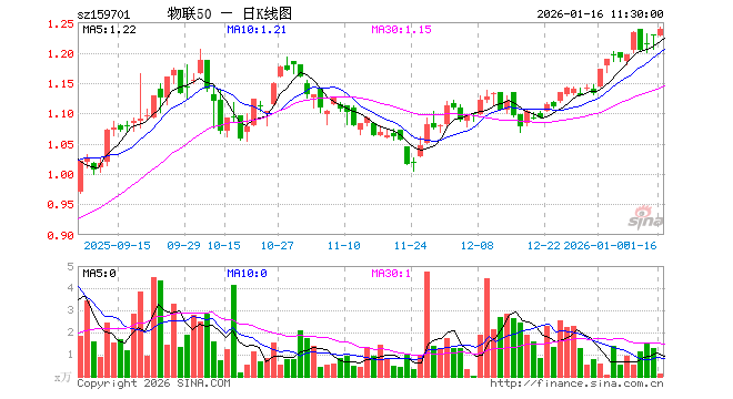 1月16日,截止午间收盘,物联网ETF招商(159701)涨0.90%,报1.239元,成交额18.07万元。物联网ETF招商(159701)重仓股方面,中际旭创截止午盘涨0.35%,立讯精密涨2.09%,汇川技术涨1.27%,中兴通讯跌0.45%,兆易创新涨7.08%,豪威集团涨1.23%,科大讯飞涨0.49%,海康威视跌1.18%,美的集团涨0.18%,海尔智家涨0.00%。