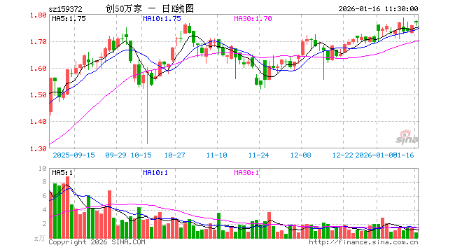 1月16日,截止午间收盘,创业板50ETF万家(159372)涨0.63%,报1.767元,成交额128.31万元。创业板50ETF万家(159372)重仓股方面,宁德时代截止午盘跌0.21%,中际旭创涨0.35%,东方财富跌0.29%,新易盛跌0.18%,阳光电源涨2.33%,胜宏科技跌0.05%,汇川技术涨1.27%,迈瑞医疗跌1.08%,亿纬锂能涨0.63%,同花顺跌2.01%。