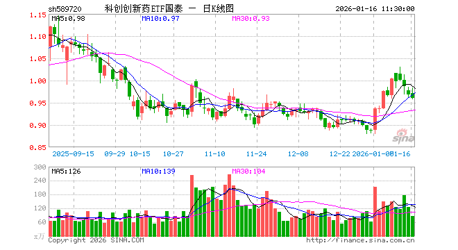 1月16日,截止午间收盘,科创创新药ETF国泰(589720)跌0.83%,报0.960元,成交额8408.98万元。科创创新药ETF国泰(589720)重仓股方面,百济神州截止午盘跌0.71%,百利天恒跌0.76%,艾力斯涨0.14%,君实生物跌2.35%,泽璟制药跌1.04%,荣昌生物涨1.61%,博瑞医药跌1.29%,特宝生物跌0.96%,益方生物跌1.17%,迈威生物跌1.77%。