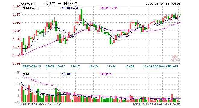 1月16日,截止午间收盘,创业板50ETF易方达(159369)涨0.37%,报1.344元,成交额118.27万元。创业板50ETF易方达(159369)重仓股方面,宁德时代截止午盘跌0.21%,东方财富跌0.29%,中际旭创涨0.35%,新易盛跌0.18%,胜宏科技跌0.05%,汇川技术涨1.27%,阳光电源涨2.33%,迈瑞医疗跌1.08%,同花顺跌2.01%,亿纬锂能涨0.63%。