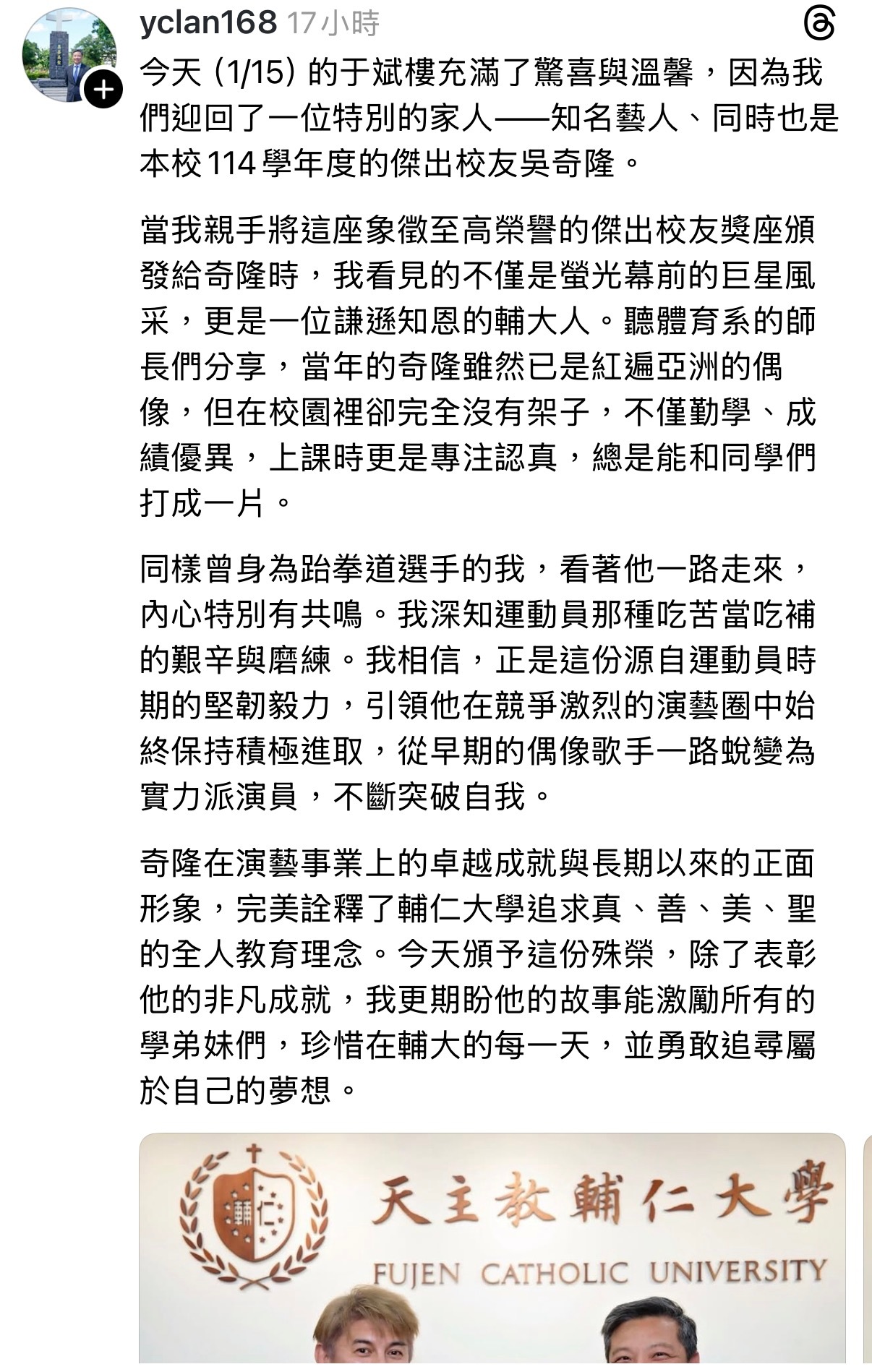 吴奇隆荣获杰出校友奖🏆近日現年55岁的吴奇隆返台,昨天现身母校辅仁大学获颁「杰