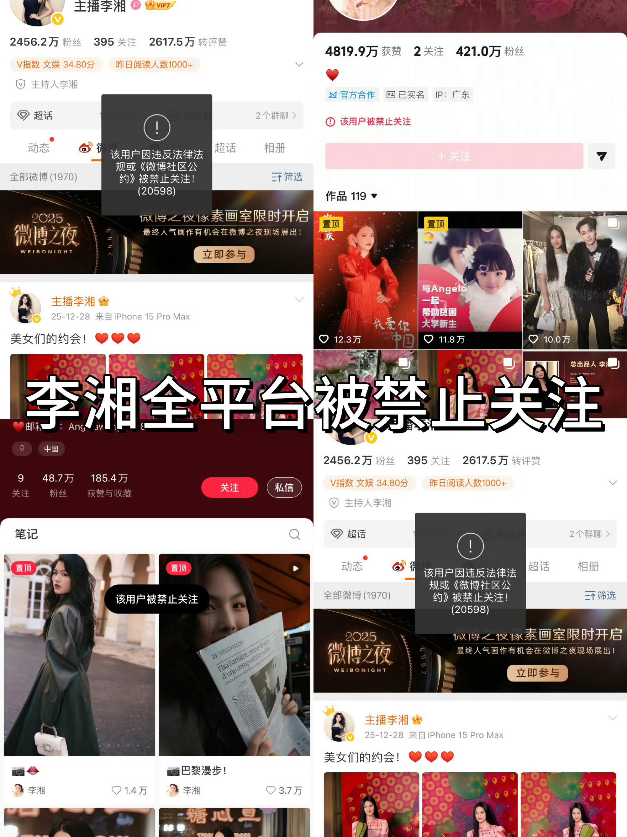 李湘全平台账号被禁止关注 woc!李湘咋了???全平台账号已经关注不了了