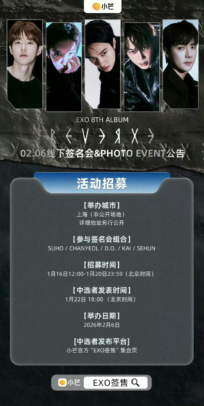 EXO官宣上海签售,有1v1合照还有团体合照环节,时间📆:2.6举行