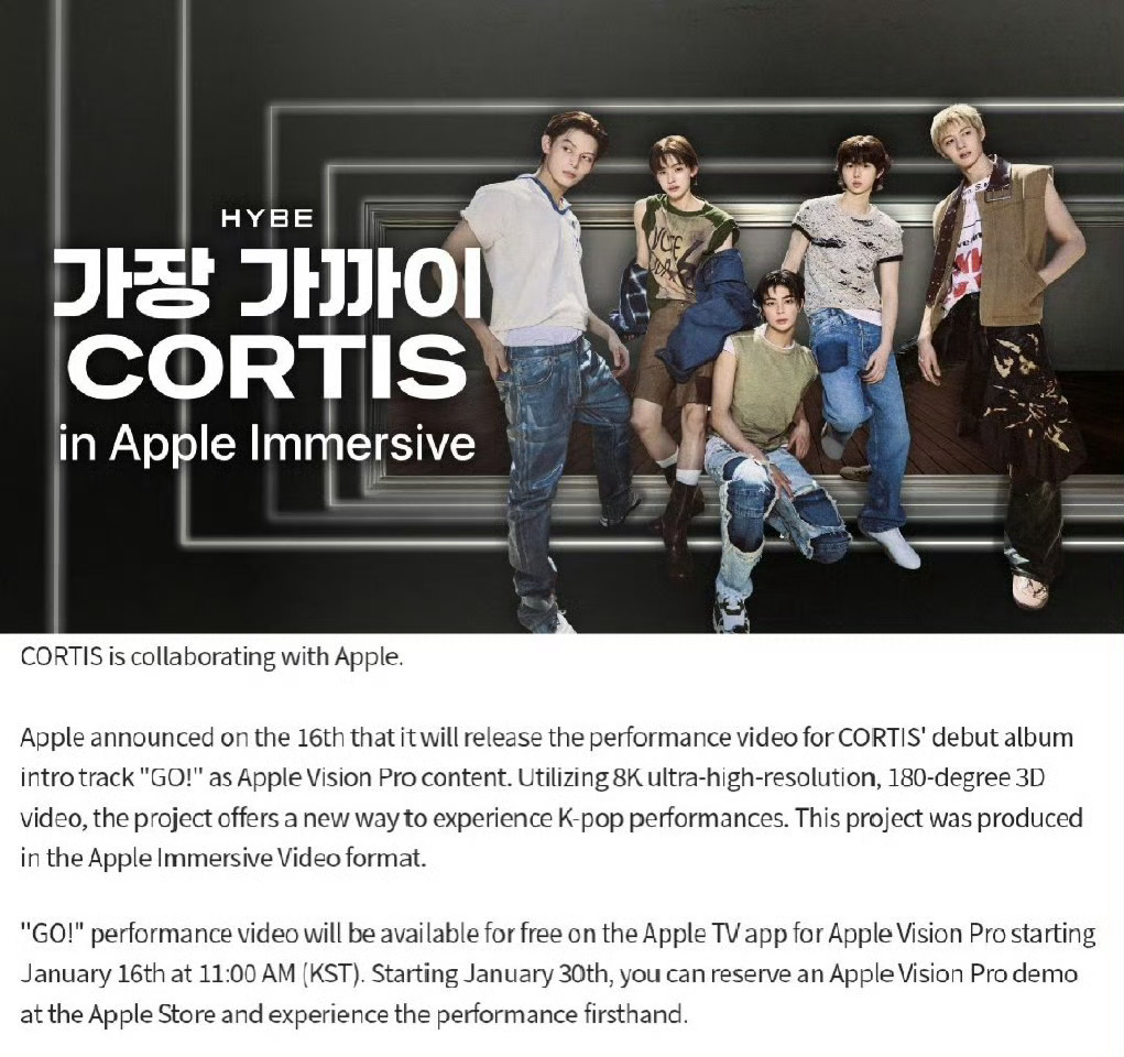 Cortis与苹果公司合作 苹果公司于16日宣布,将把Cortis出道专辑的先行曲《GO!》的表演视频,作为Apple Vision Pro专属内容推出🎶