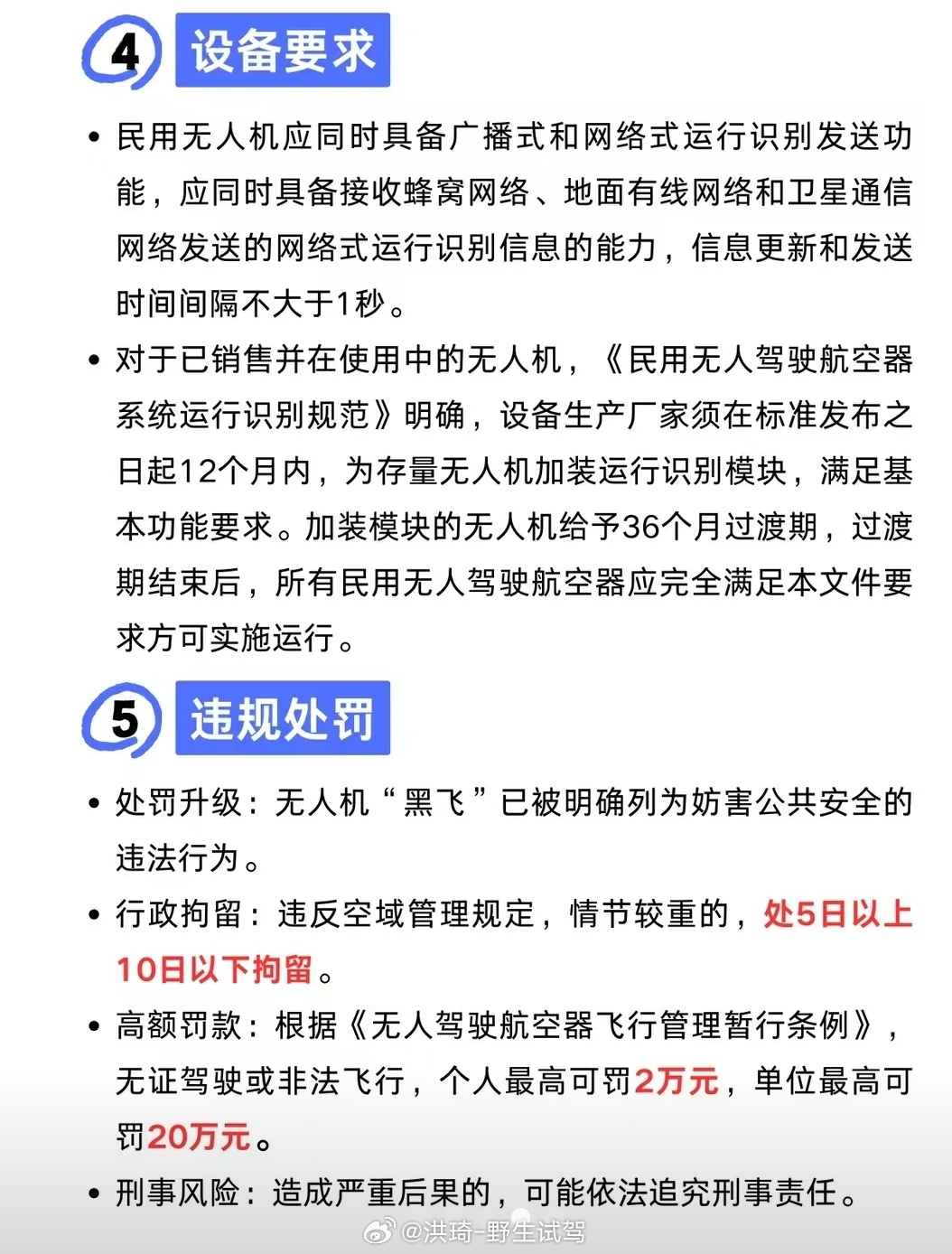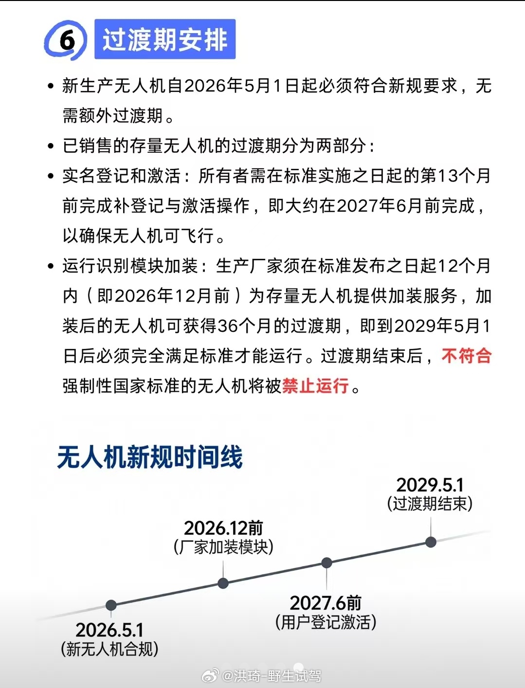 无人机新规,完善了新国标无人机要求,设置了过渡期,明确了红线(黑飞拘留)。但对绝