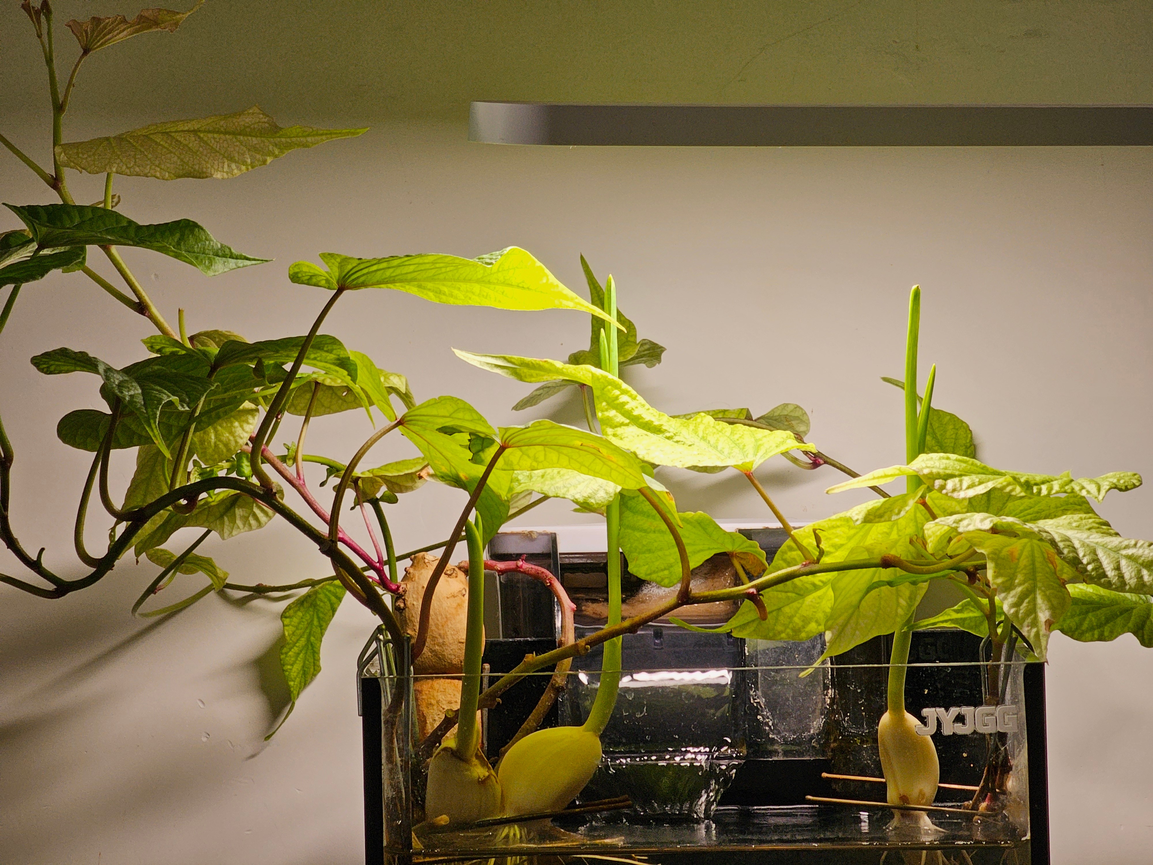 继水培红薯之后,前几天腌腊八蒜的时候,又水培了三颗大蒜,蒜苗长势喜人。辣椒树挪到了有暖气的地方,如果能顺利过冬的话,明年就可以变成多年灌木了。薄荷原本是其中最丰茂的,不幸被狗啃了,一根没剩,还好最近发现又从土里酿出几株薄荷苗。乌龟在鱼缸里太暖和不冬眠,挪去了阳台,还是不冬眠,可能天天想着吃鲫鱼自助,心有鱼而嘴不足。……