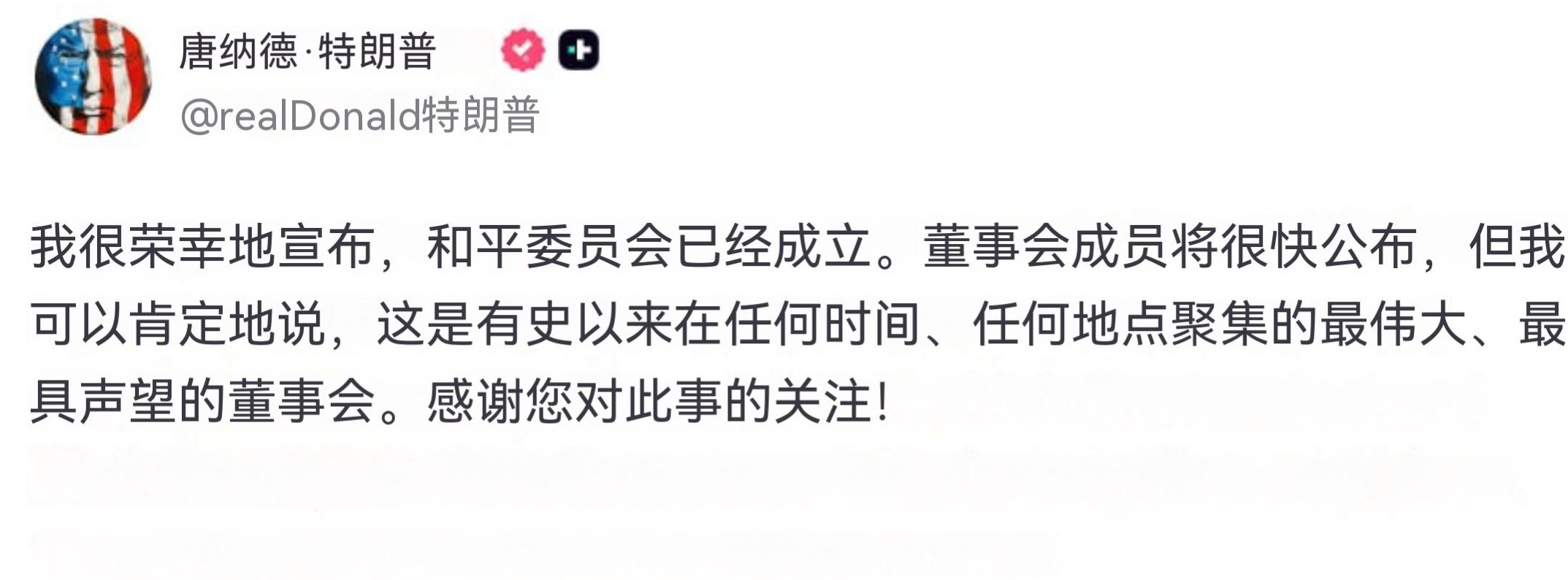 特朗普宣布成立加沙和平委员会:我很荣幸地宣布,和平委员会已经成立。委员会成员名单