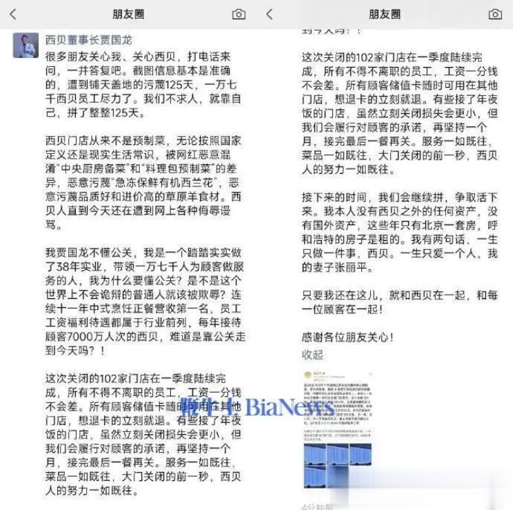 西贝一次性关闭102家门店,贾国龙:因预制菜争议被污蔑125天