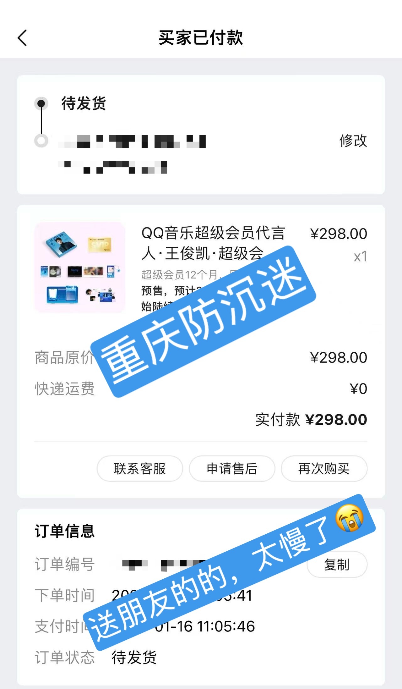 忙忙碌碌一上午,忘记晒单了,6秒下单我一定是第一批吧!莫辜负!(另一个送我朋友用她自己浩买的,太慢了)qq音乐超会代言人王俊凯 / 小小蟹意,不成敬意