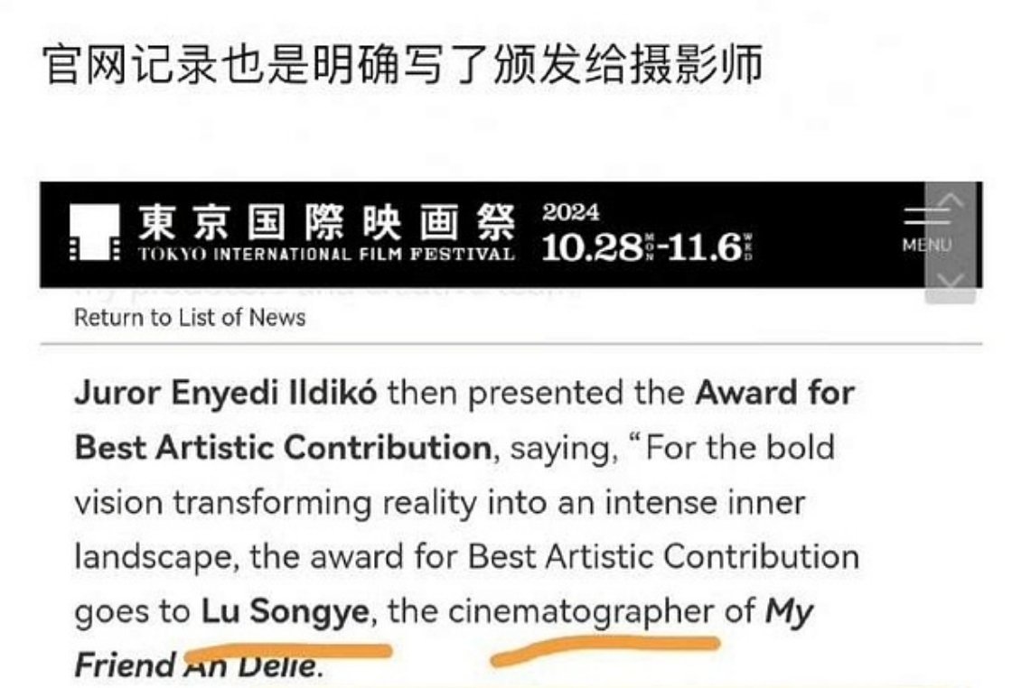 A类电影节的“最佳艺术贡献奖”是要颁发给负责电影美学艺术的幕后工种。有时候某个工种格外突出就会注明是给该名工作人员单人【to XXX】。例如东京《我的朋友安德烈》注明【to吕松野】、柏林《推拿》【to曾剑】。这都是吕松野和曾剑的个人奖。如果当年没有注明具体给谁,而是直接颁发给电影本身,这才叫电影集体奖。例如《老枪》颁奖时的画面。某瓣为何后来又硬加上了董子健,只有被公关能解释通了,一个文艺app和片方、导演一起偷奖……就退一万步讲,你董子健也不该在前前后后只字不提吕松野。