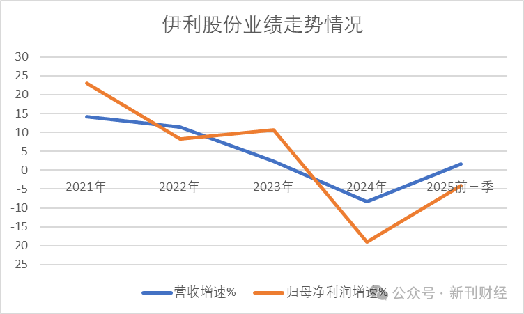 然而,行动往往比言语更具说服力。此次减持发生在伊利股价处于28元/股左右的阶段,较46元/股的历史高位有明显回调。同时,公司近期业绩增长显露疲态,2024年全年,公司营收与净利润分别同比下滑8.24%和18.94%。进入2025年,虽然下滑幅度有所收窄,但并未得到根本性扭转,前三季度营收同比仅微增1.71%,而净利润则继续下滑4.07%。