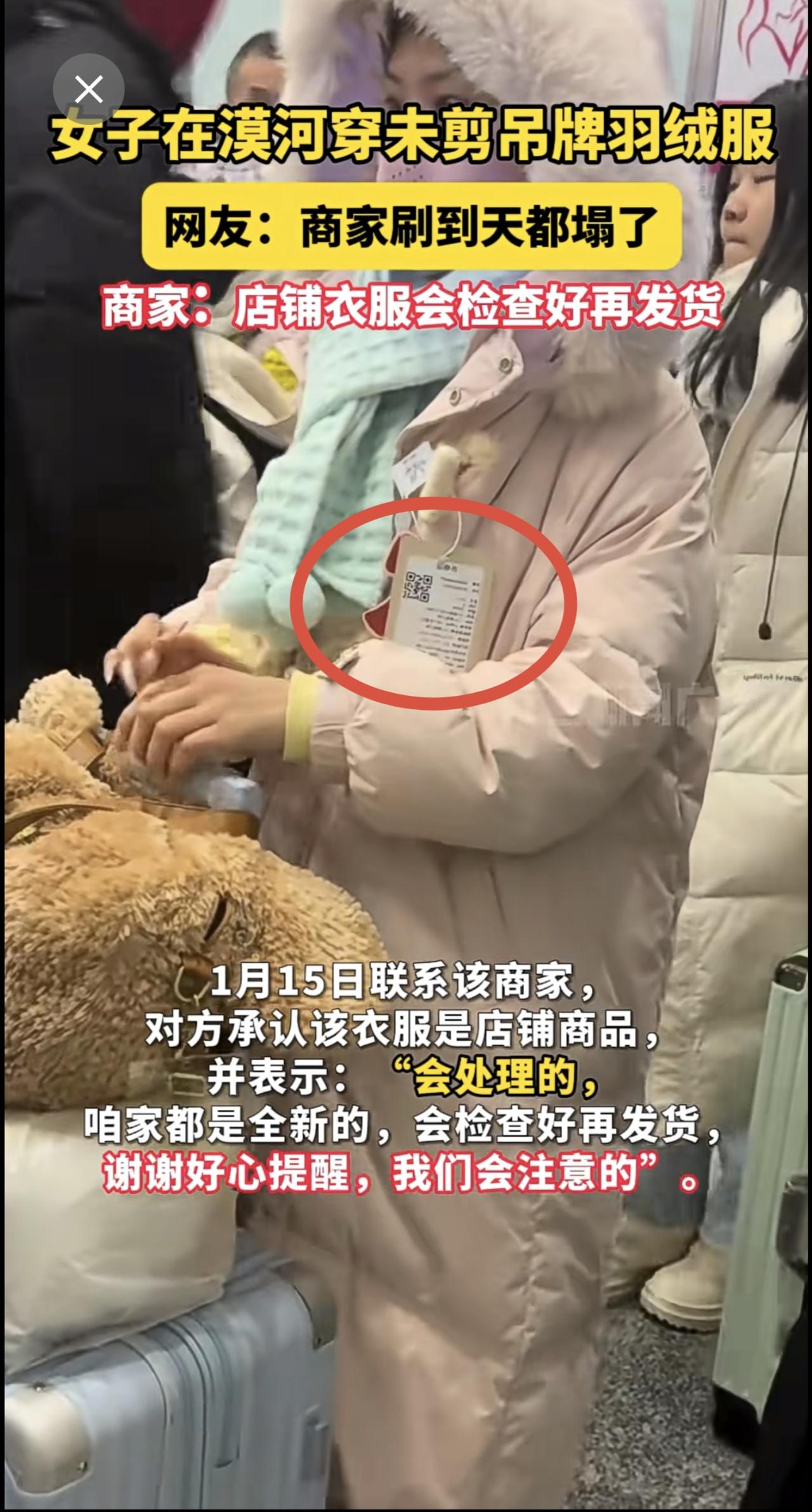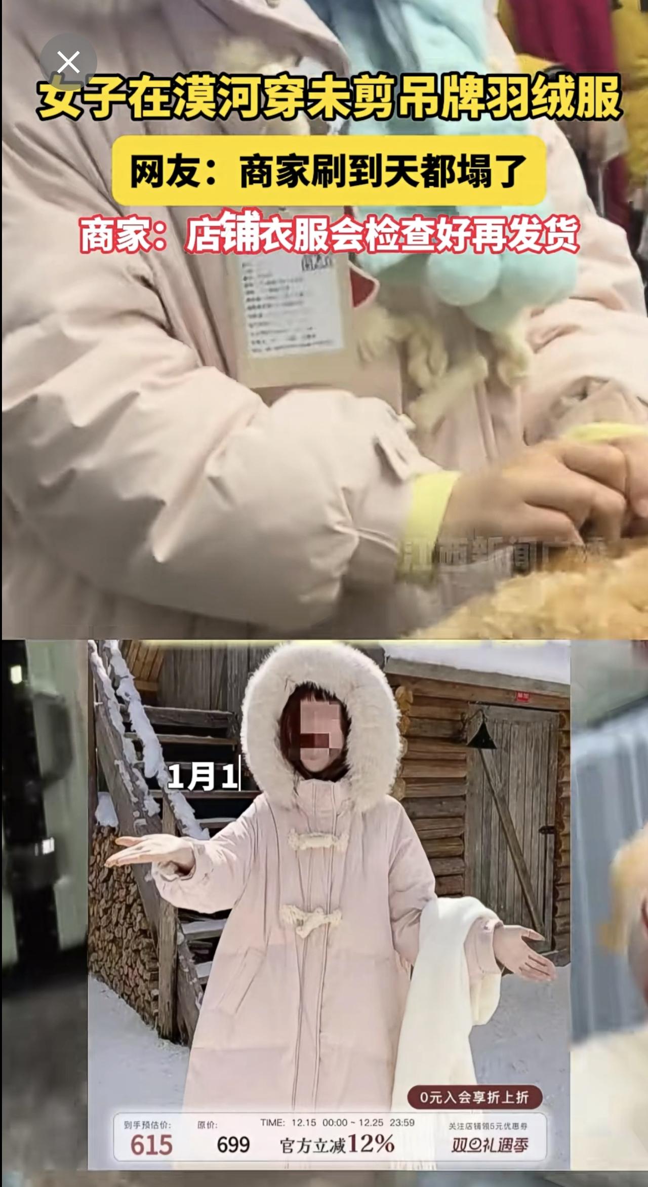 女子在漠河穿未剪吊牌羽绒服,网友:商家刷到天都塌了,商家:店铺衣服会检查好再发货