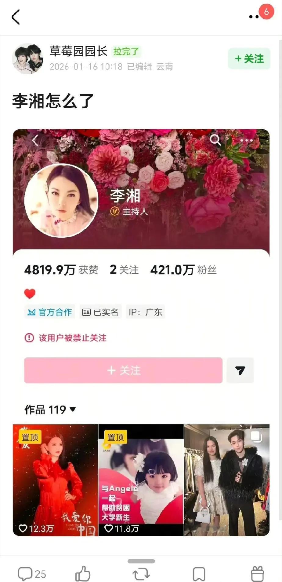 李湘多平台账号被禁止关注! 李湘的微博、抖音、小红书账号均显示“该用户被禁止关注”,但账号未被完全封禁,历史内容仍可查看,仅限制新用户关注功能。微博页面明确标注“因违反法律法规或《微博社区公约》”导致功能受限,事件最早于1月15日被网友发现(抖音平台),1月16日经“红星新闻”等媒体确认后发酵。截至16日,李湘本人及工作室未公开回应,平台方也未披露具体违规细节。李湘多平台账号被禁止关注 李湘 李湘育儿观念 李湘旧照 李湘理财观 李湘减肥记