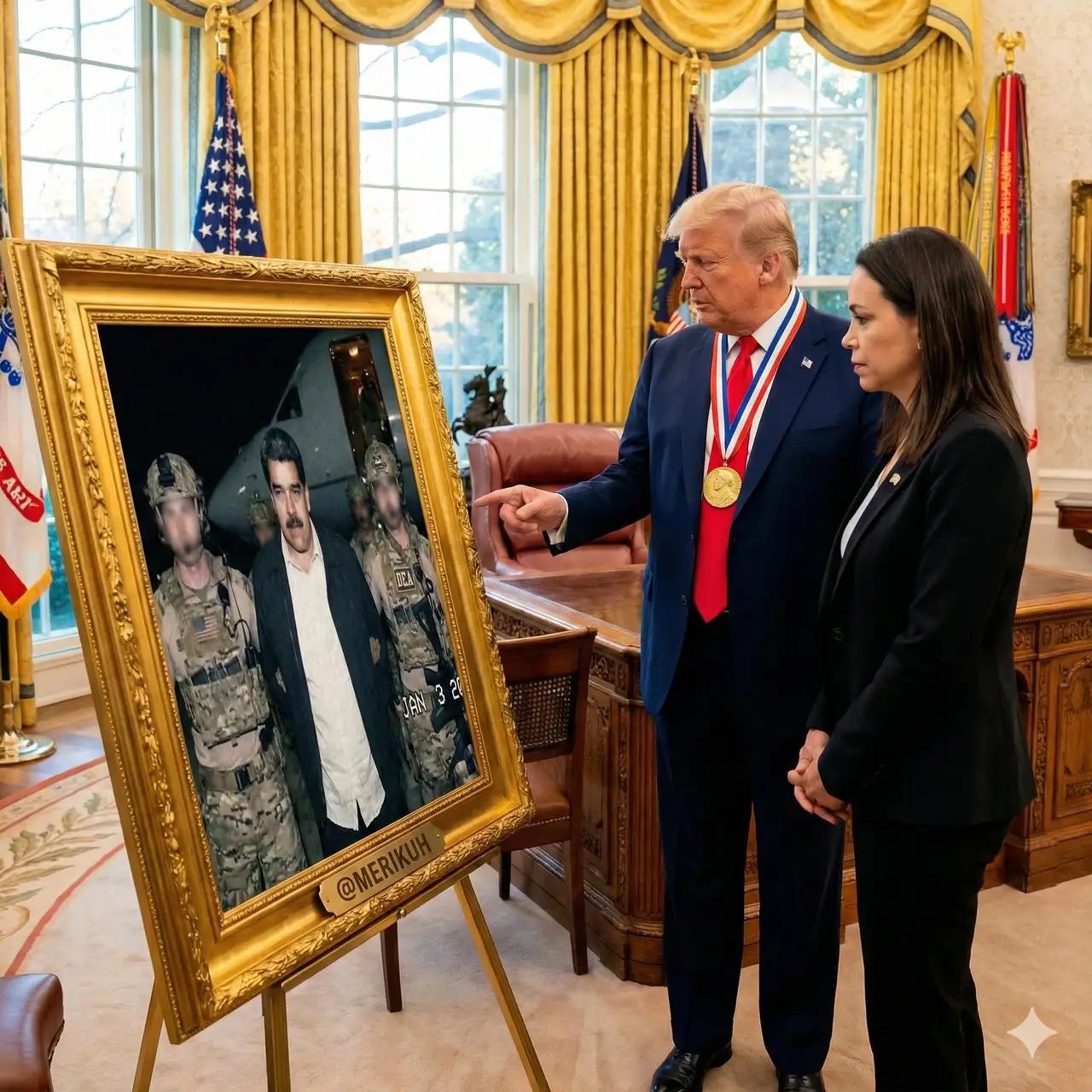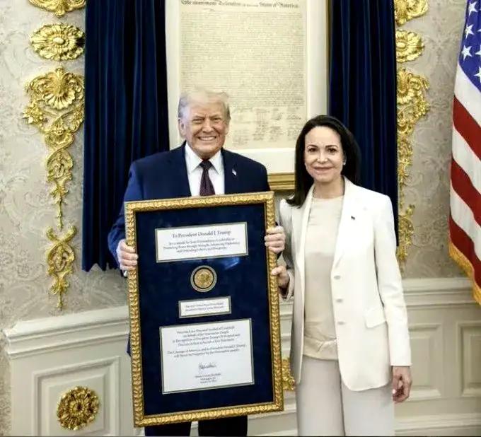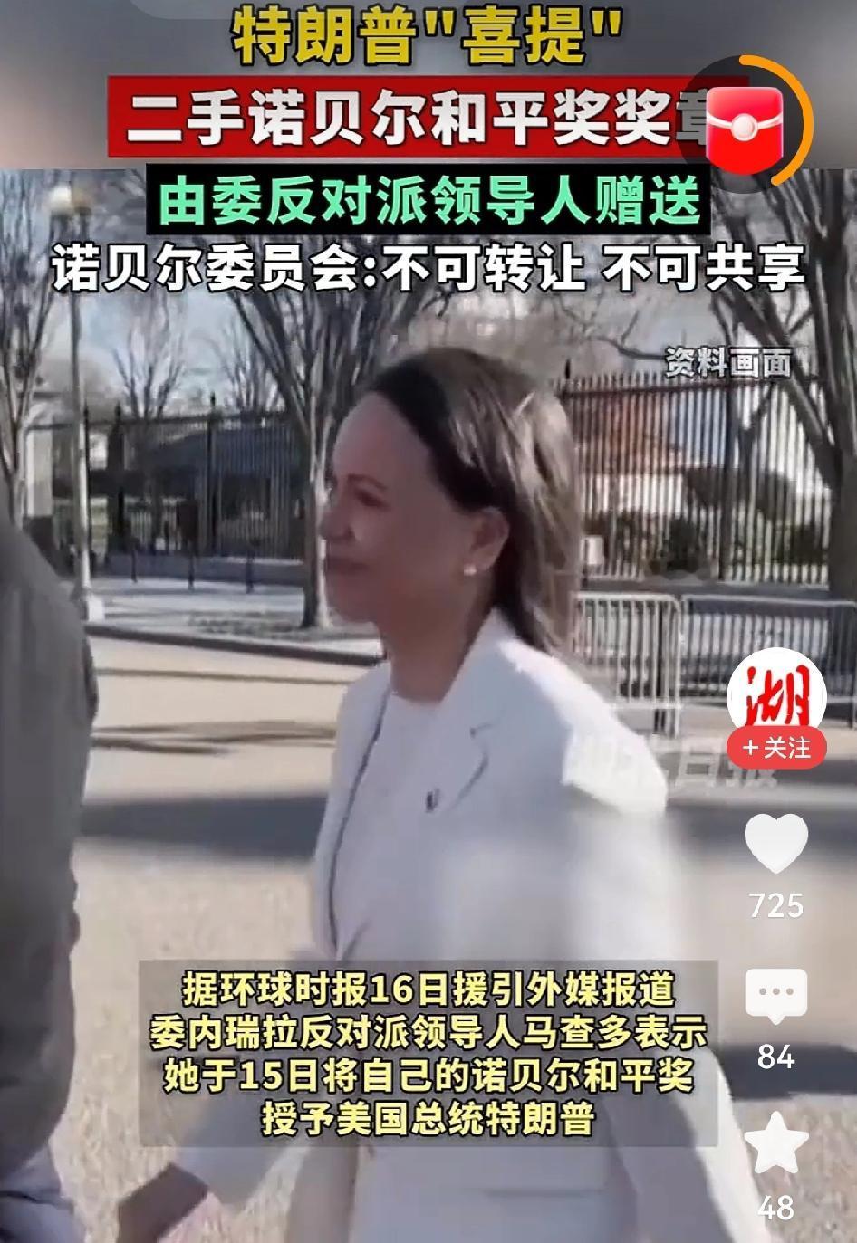 为特朗普“颁奖”。委内瑞拉反对派领导人马查多意气风发把自己的诺贝尔和平奖章送给了美国总统,还夸他“为委内瑞拉自由做贡献”。表面看似是“真情流露”,而内心则是在瞄委总统宝座。之前,诺贝尔委员会早就打脸:奖章根本不能转让!特朗普一边收下奖章,一边撇清说“没主动要”,这出戏码简直比剧本还精彩。马查多这么拼命贴美国,无非是想蹭点外部支持,幻想当委内瑞拉总统,可国内老百姓会买账吗?近日委内瑞拉街头已有抗议声音,指责这种“亲美秀”背离民意。说到底,政治礼物送得再勤,若没有本国人民撑腰,不过是空中楼阁罢了。