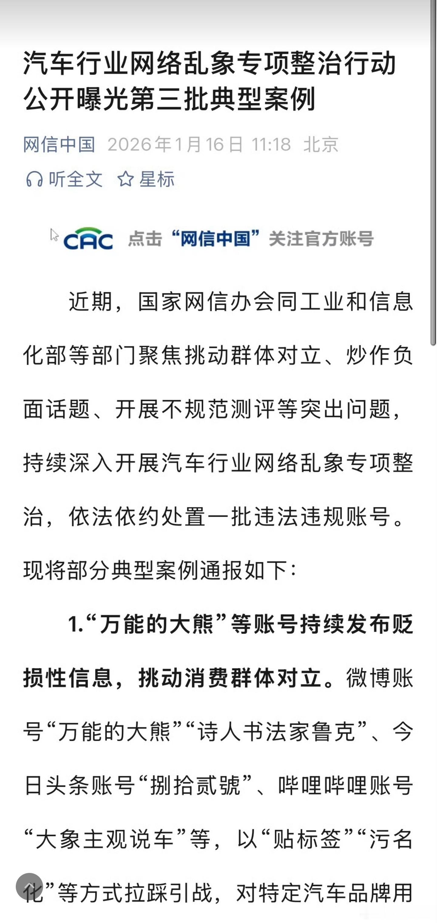 汽车之家冬测不规范测评被通报国家网信办等部门近期开展汽车行业网络乱象专项整治,通报部分典型案例:部分账号通过拉踩引战、恶意抹黑、歪曲解读财报等方式挑动对立、诋毁企业,或开展不规范测评误导公众。汽车之家,太平洋汽车,相关账号已被依法依约处置。