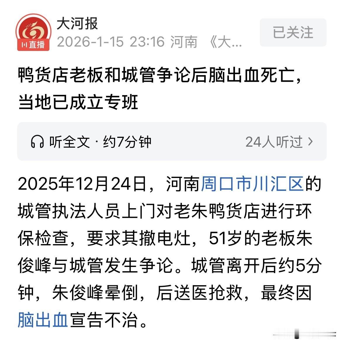 河南周口,男子开鸭货店,遇有关人员上门做环保检查,对方要求把2个电灶撤了,男子说生意不好,平常只用1个电灶,店里不炒菜,油烟不大,但对方依旧要求整改,男子很气愤,说自己只开一个火也不行,那生意还咋做?他情绪激动争论几句后,对方离开,谁料五六分钟后,男子突发脑溢血,最终离世。 2025年7月,老朱开了家鸭货店。 为了这家店,他投了不少钱装修,9月3号才正式开张。谁知才开没多久,麻烦就找上门了。 家属透露,开业前设备都是按城管要求买的,验收也合格。可一到年底,这帮人就却三天两头来找茬。 2025年12月23号中午,两个穿制服的城管进店做环保检查,并要求他们把电灶撤了。 老朱说,店里其实就一个电灶卤鸭货,另一个电灶偶尔煮菜,还有个电烤鸭炉。平时只卖烤鸭凉菜,根本不炒菜,哪来的重油烟? 但城管指着抽油烟机说:这机器最多带两个电灶,或者一个灶一个烤炉,多了就得整改! 老朱是个老实做生意的,不想惹事。城管走后,他赶紧把那个插电的锅线拔了,扔一边。 接着,又费劲把烤鸭炉挪到了抽油烟机底下,心想这下总该行了吧? 第二天,也就是12月24日号上午11点多,那两名城管又来了。 一进门,领头的就没好气地吼:整好没?我看你是连动都没动! 其实当时抽油烟机下确实摆了两个灶和一个烤炉,但老朱觉得自己冤枉啊,他着急地说:你们说让我咋弄?还让不让做生意了?我只开一个火还不行吗? 城管盯着烤鸭炉,非说那一直在烤。 老朱说,那是灯泡在加热,根本没烤!那锅我立马就拔了,料也没煮……一次就开一个灶,这也不让开? 这一来二去,两边火气都上来了。 老朱一辈子要强,哪受过这种窝囊气,当时绝望地喊了一句:你们说这不中那不中,干脆我跳楼去吧! 城管倒是挺淡定,回了一句:这是俺工作,该咋汇报咋汇报。 说完,两人转身走了。那是11时41分30秒。 城管刚走五六分钟,老朱突然觉得天旋地转。监控里能看到,他妻子从销售间过来,老朱身子一歪就要倒。 妻子吓坏了,死死抱住他,想扶又扶不动,想去拿手机又不敢松手。 那是最煎熬的几分钟。11时50分,妻子好不容易从老朱兜里摸出手机,给在附近的大儿子打微信电话。 巧的是,大儿子骑着电动车刚到门口,手机在兜里没听见铃声,错过了救命的第一通电话。 直到11时53分,大儿子回拨了120。12点01分救护车才到,把人拉走时,老朱已经没意识了。 到医院一检查,老朱脑溢血了。医生说,人送来时就已经病危了,哪怕做了开颅手术,也就是靠呼吸机吊着一口气。 家属不甘心啊,硬是让医生用药撑了两天。 12月26号,看着各项指标都衰竭了,只能把人拉回家。 第二天,老朱就在家里断了气,30号下了葬。 这事儿最让家属愤概的是,两次检查,城管都没亮过证件,也没给个红头文件说为啥非得撤灶。 2026年1月9号,家属去找城管局和街道办要说法。 负责人倒是见了,可说出的话让家属心凉。他表示,涉事城管没啥大过错,就是因为附近监测站PM2.5高,怀疑是油烟,所以才常态化检查。 至于为啥非要盯着老朱家的电灶?负责人支支吾吾,也说不出个具体法律依据。 但他承认了一个细节,那就是执法记录仪戴了,但是没打开。 如今,官方说肯定会解决,建议家属找律师谈。 那么,从法律角度,怎么看这事? 《行政处罚法》第55条规定:执法人员在调查或者进行检查时,应当主动向当事人或者有关人员出示执法证件。当事人或者有关人员有权要求执法人员出示执法证件。执法人员不出示执法证件的,当事人或者有关人员有权拒绝接受调查或者检查。 老朱家属反复强调两次检查城管均未出示证件。如果这个事实成立,那么从法律上讲,老朱当时完全有权依据该法条拒绝接受检查。 结合《行政处罚法》第47条关于“行政机关应当依法以文字、音像等形式,对行政处罚的启动、调查取证、审核、决定、送达、执行等进行全过程记录”的规定,以及各地推行的行政执法三项制度,全程录音录像已成为硬性要求。 官方承认城管有戴执法记录仪,但未打开,这属于严重的程序失职。 现在的结果是死无对证,监控视频成了唯一证据,但监控无法收录现场全部对话。 这种由于行政机关自身未履行记录义务导致的事实不清,在后续的行政复议或诉讼中,依法应由行政机关承担不利后果。 作为专业的执法人员,依据行政法的比例原则和人性化执法要求,应当意识到当事人处于情绪崩溃边缘,应当采取缓冲措施,如暂停执法、安抚情绪…… 而不是机械地回怼:这是俺工作……该咋说咋说。 这种缺乏温度的执法回应,客观上对老朱的情绪起到了“最后一根稻草”的负面作用。 如果因情绪激动诱发疾病,行政机关可能需要承担一定的补偿或赔偿责任。 对于这件事,你怎么看? 欢迎关注@一案一论