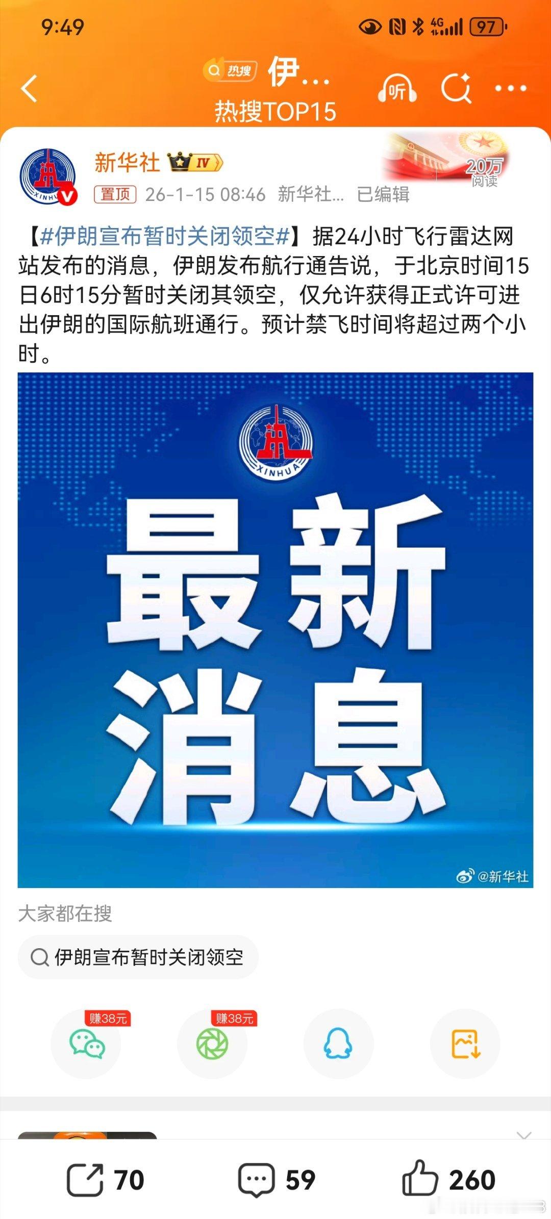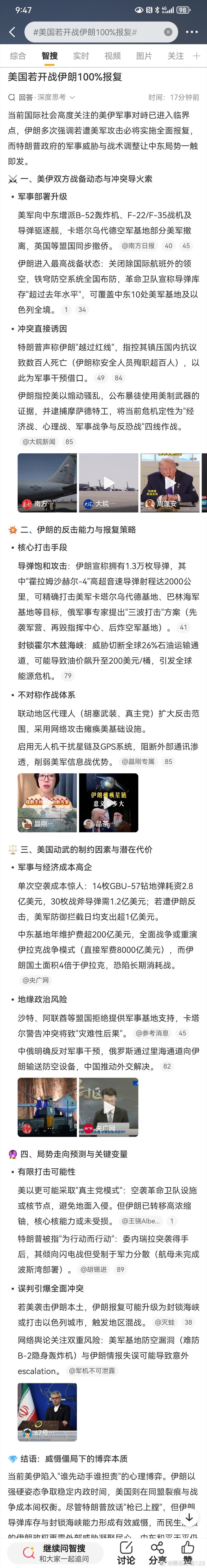 新闻连起来看,中东地区,让人嗅到了一股浓浓的火药味。伊朗内乱,只是前奏。平息内乱,死了人,是往灶里添了一把柴火。人员撤离,关闭领空,发出警告,向外界释放出的信号,耐人寻味。每个人都渴望和平,但战争的阴霾犹如瘟疫一般,躲是躲不掉的。伊朗宣布暂时关闭领空美国若开战伊朗100%报复以色列最高戒备防空系统已打开美军驻卡塔尔基地部分人员被建议撤离