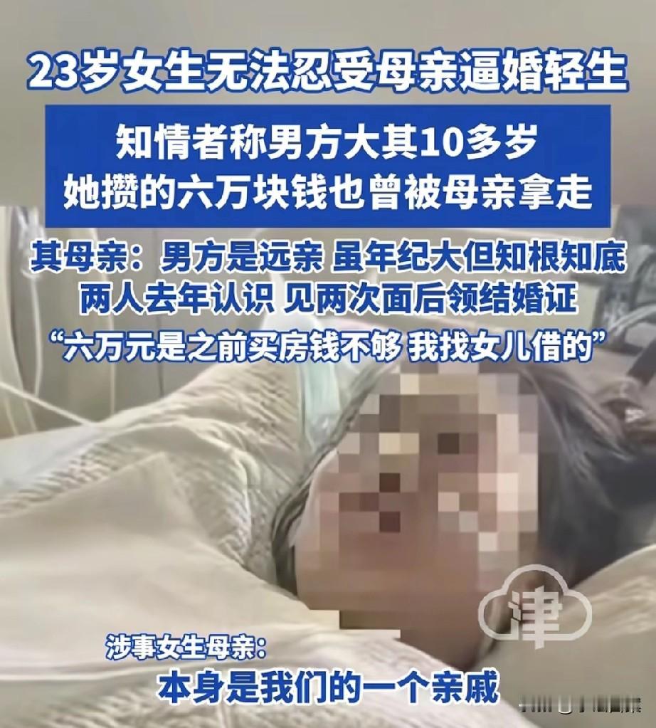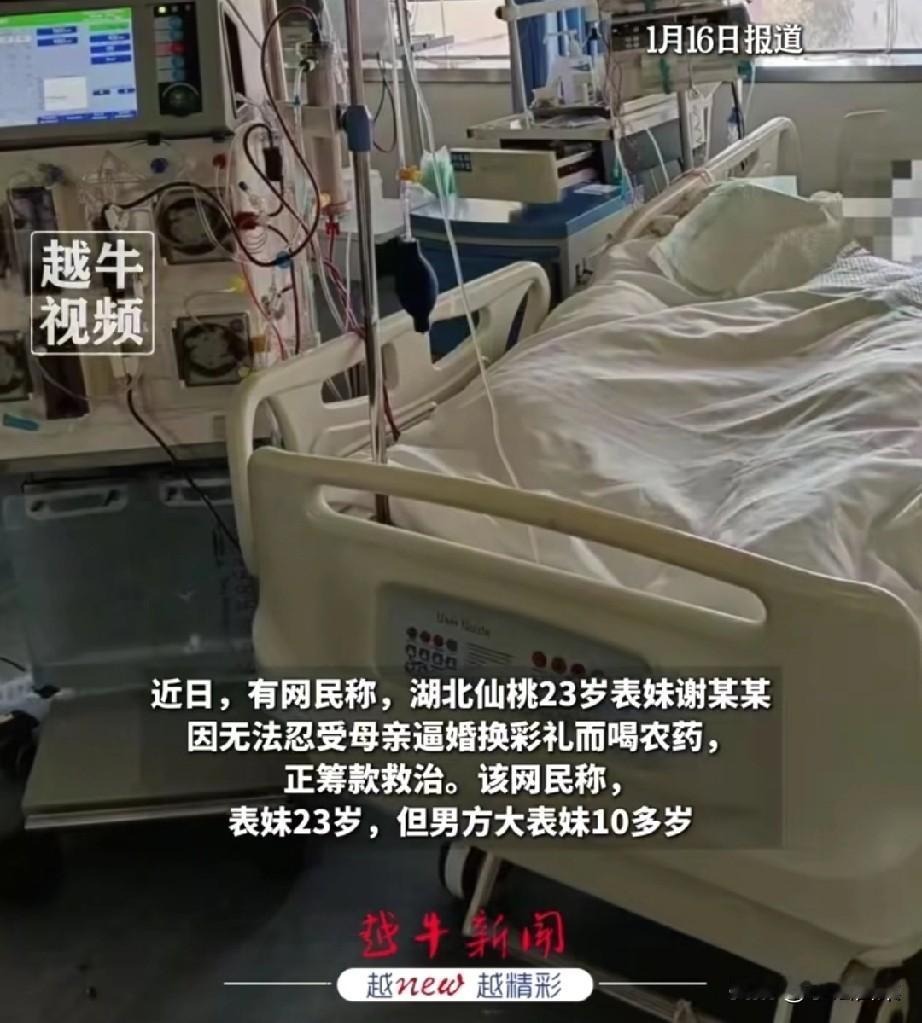被逼婚喝药轻生的23岁女生已醒来,对方大她16岁,母亲曾拿走她的6万块钱去买房。事发后,母亲对这一切的解释,还真是矛盾,难以自圆其说! 女孩谢某是湖北仙桃人,23岁按道理说年纪不算大,可却被母亲催嫁逼婚。 若是考虑女儿幸福,倒还情有可原,可谢某母亲催女儿嫁人的男方已经39岁了,足足大谢某16岁。 谢某回老家与之相亲见面后,没几天就领了结婚证,当时她就有明显的不开心,只不过性格内向软弱,不敢反抗,后来便选择了喝农药轻生。 谢某表姐将此事曝光网络,称谢某母亲逼表妹结婚是为了彩礼。 在此之前,谢某打工辛苦攒下的6万,也被母亲拿走买房,而房子的总价也才十几万。如今中毒需要救命,只能通过募捐筹款。 事发后,母亲的解释明显存在矛盾: 首先是对男方,他是谢某家远方亲戚,母亲一方面说知根知底,一方面又说之前没见过,甚至连具体年龄都搞不清楚。 其次是6万元,母亲说是找女儿借的,现如今谢某命悬一线,她为何不赶快卖房救人呢? 最后是嫁人,母亲说不要彩礼,给了彩礼也会让女儿带过去,那谢某年龄还这么小,完全可以找同龄人,为何非要逼她嫁给大这么多的男人呢? 这些显然都是解释不通的! 好在现如今谢某已经醒来,只不过身体虚弱,还需要后续治疗,当地妇联也已经介入跟进,相信不久后会真相大白。 婚姻是人一辈子的头等大事,无论男女,得配良缘实在是太重要了。如果真的有人为了彩礼,逼女儿往火坑里跳,那真的太过悲哀…… 【来源;越牛新闻】