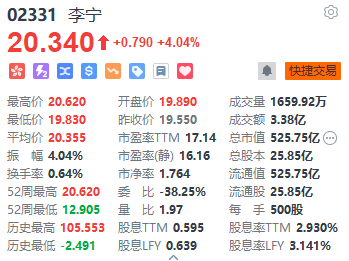 上证报中国证券网讯(记者刘逸鹏)1月16日,李宁一度涨超5%,截至13时14分,涨4.04%,报20.34港元/股。